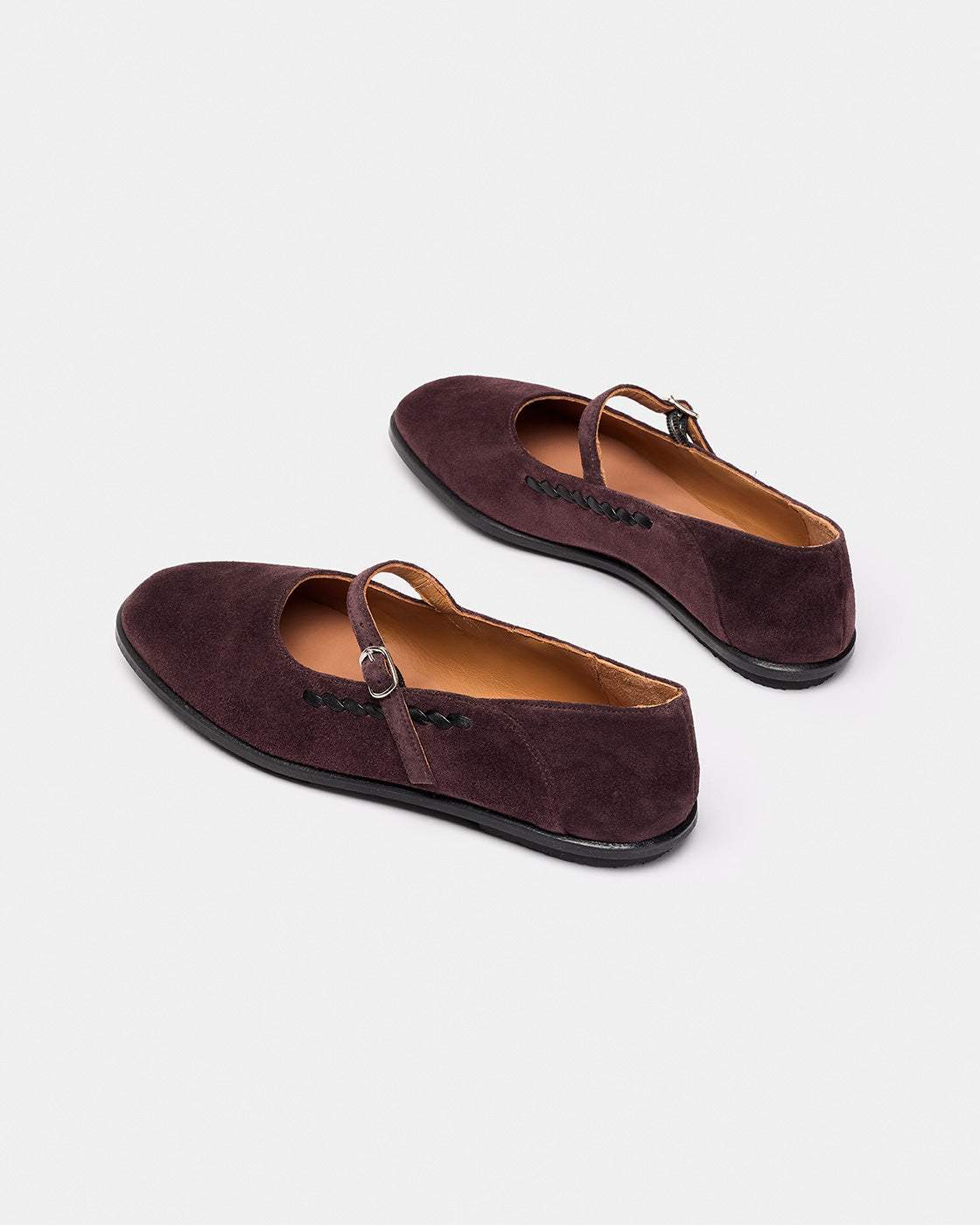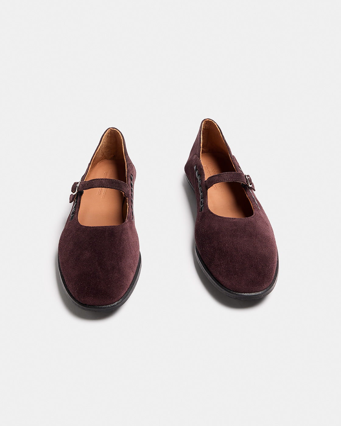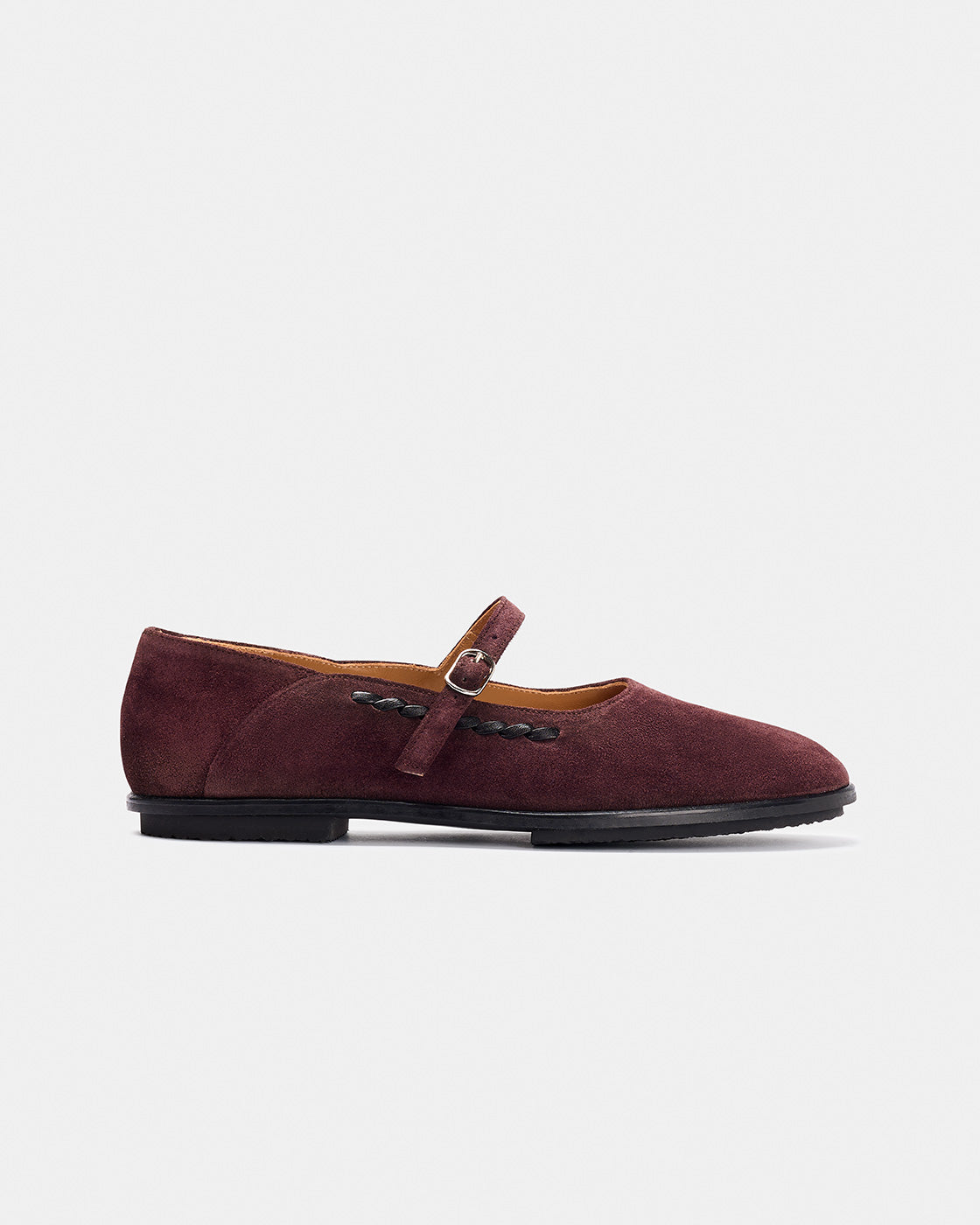 SONIA is a Mary Jane style shoe. The upper is suede leather with a braided goatskin detail on the side. Buckle closure. Natural cowhide lining and insole. The sole is a split tread of virgin rubber, with a leatherlite heel and midsole. Round toe. 1 cm heel height. Made in Spain.