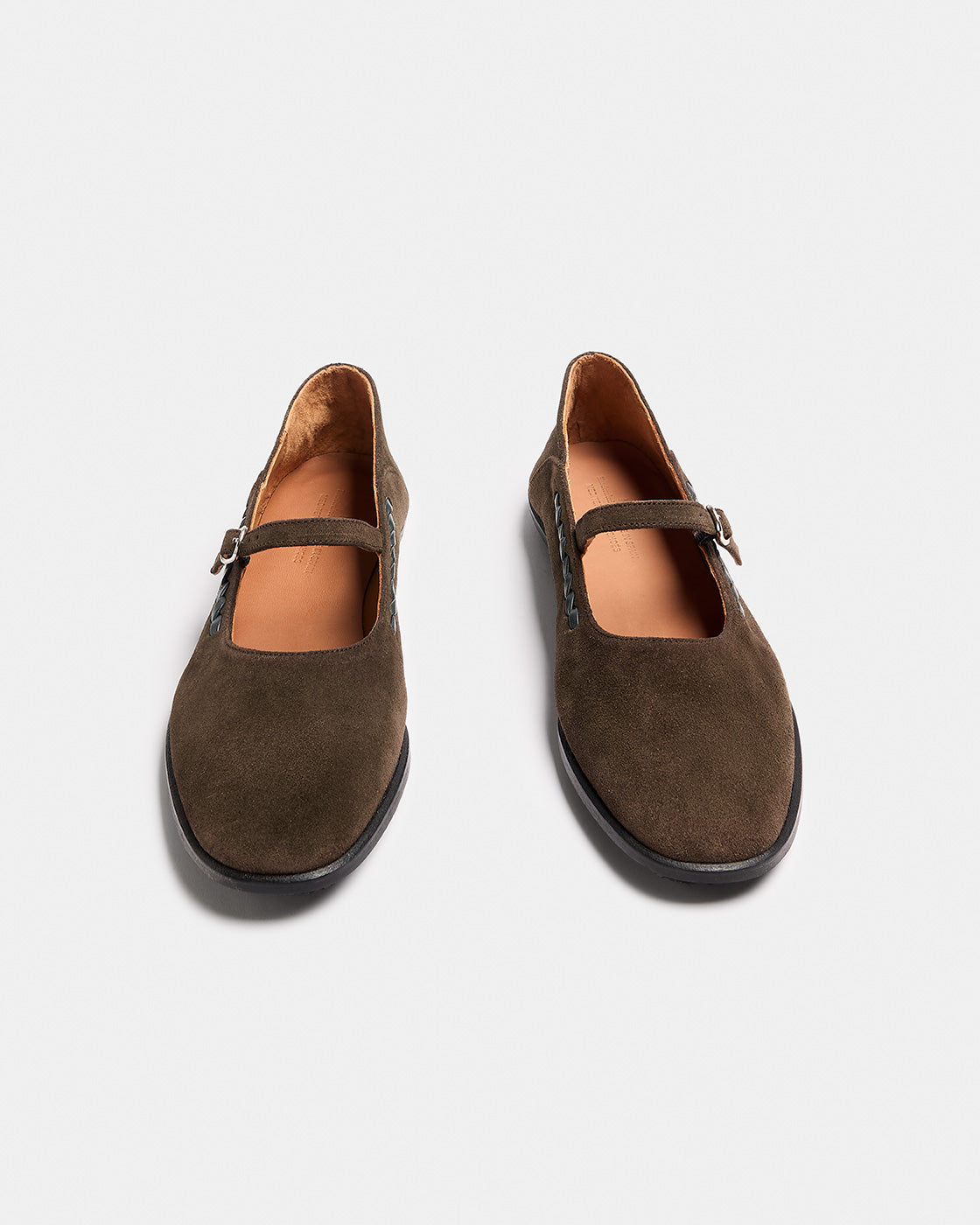 SONIA is a Mary Jane style shoe. The upper is suede leather with a braided goatskin detail on the side. Buckle closure. Natural cowhide lining and insole. The sole is a split tread of virgin rubber, with a leatherlite heel and midsole. Round toe. 1 cm heel height. Made in Spain.