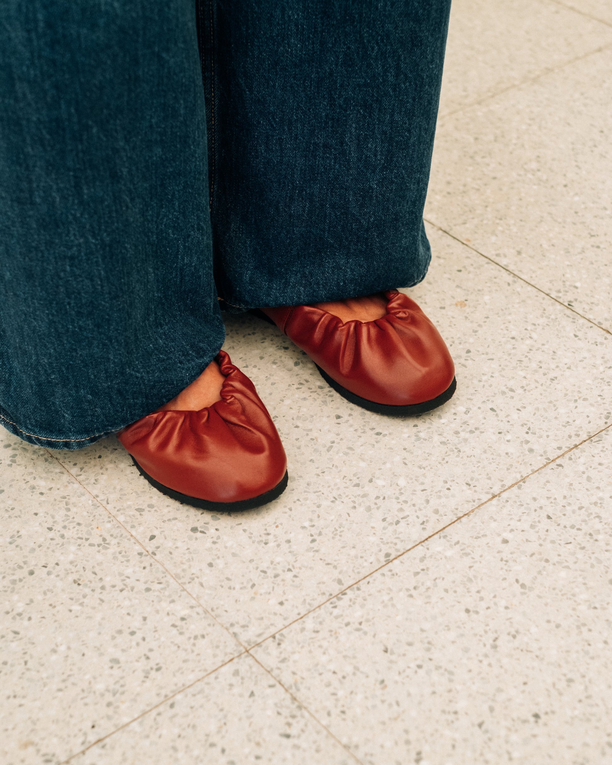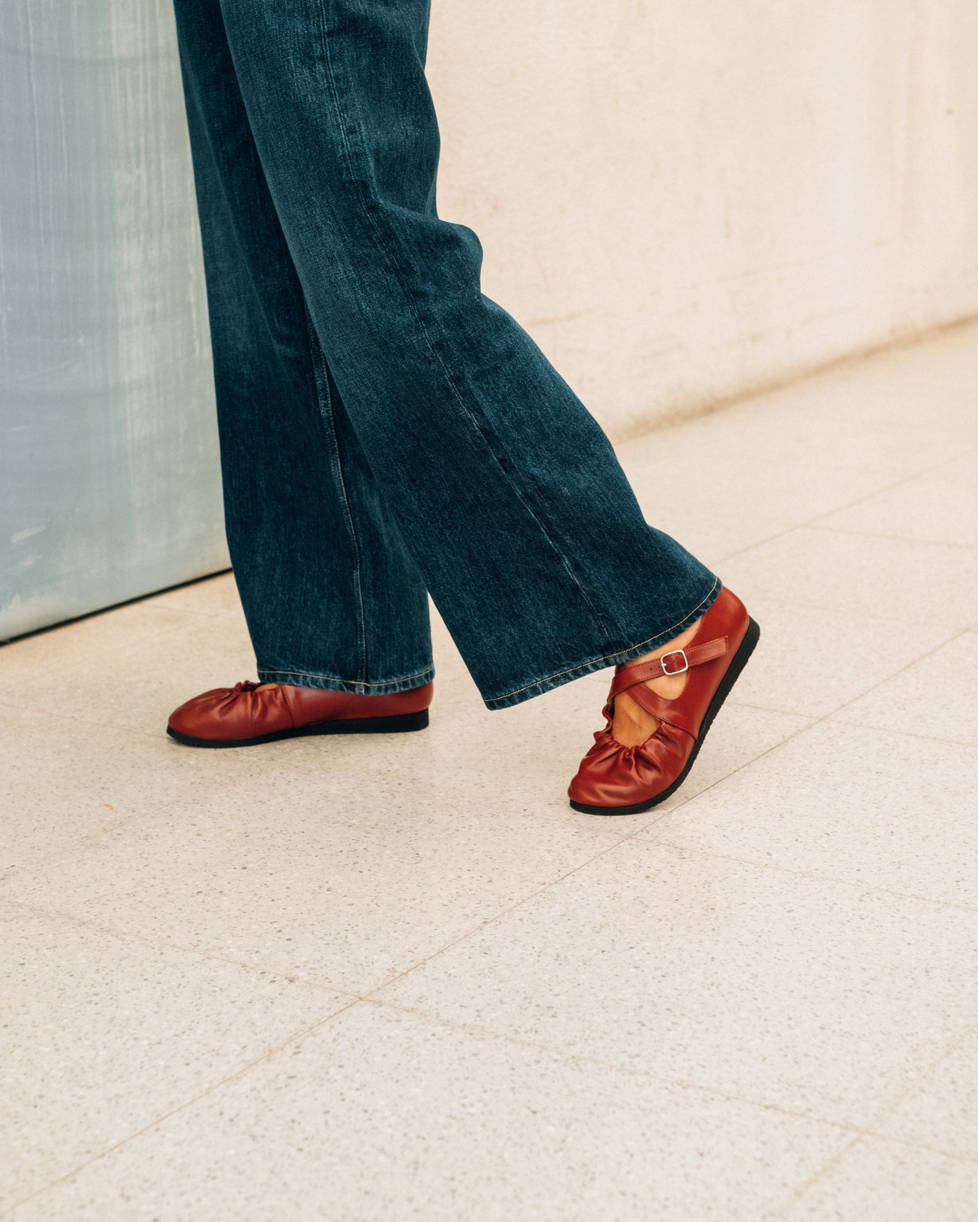 BEC is a ballet flat with crisscross straps across the instep and a gathered toe. The upper and lining are sheepskin. The strap fastens with a buckle. The insole is padded and lined with natural cowhide. The sole is made of virgin rubber with a wedge heel. The round toe is 2 cm high. Made in Spain.