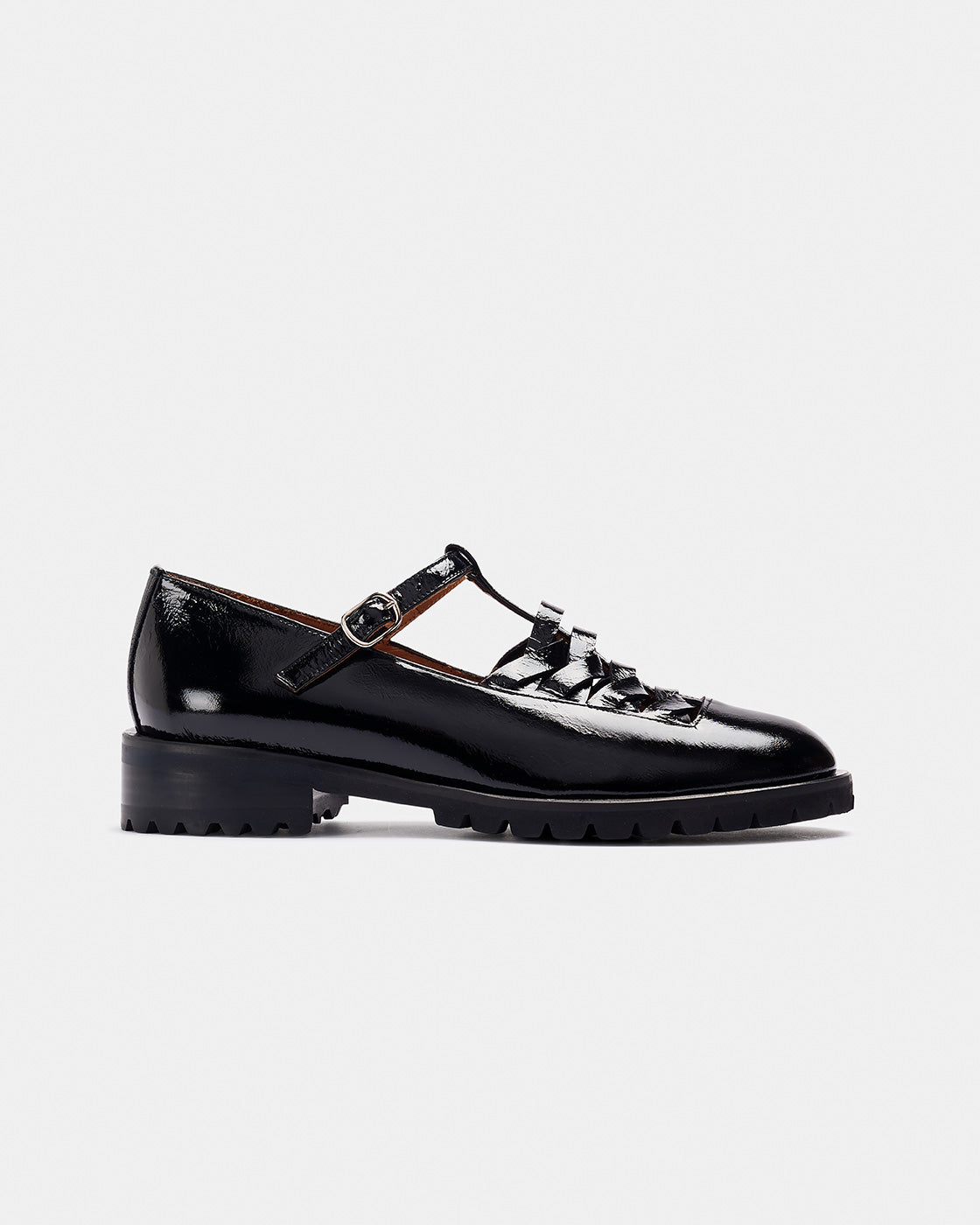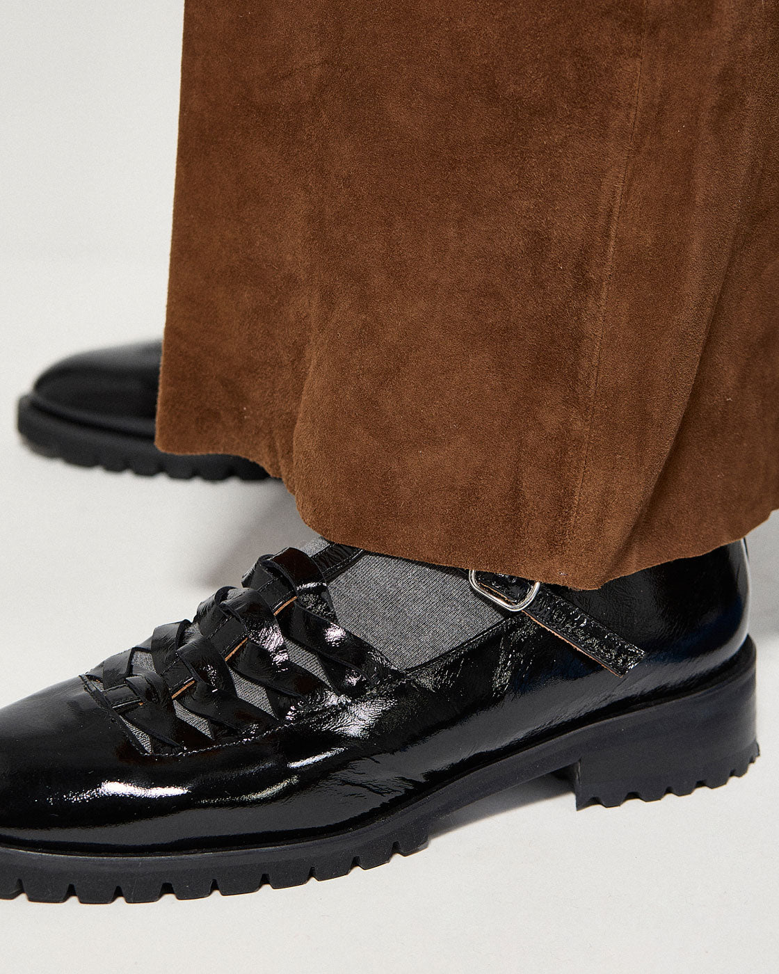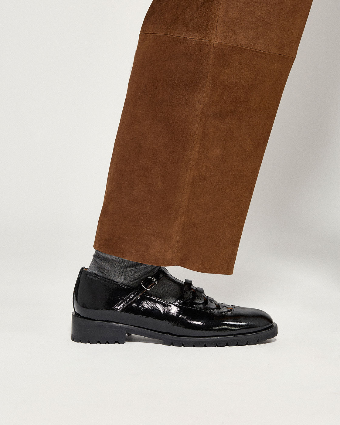 IMAI is a T-shaped Mary-Jane shoe. The uppers are made of cowhide with a suede detail at the toe. Round toe. Natural cowhide lining. Removable foam insole. Non-slip rubber tread sole. The total height is 3 cm for greater comfort for your back.