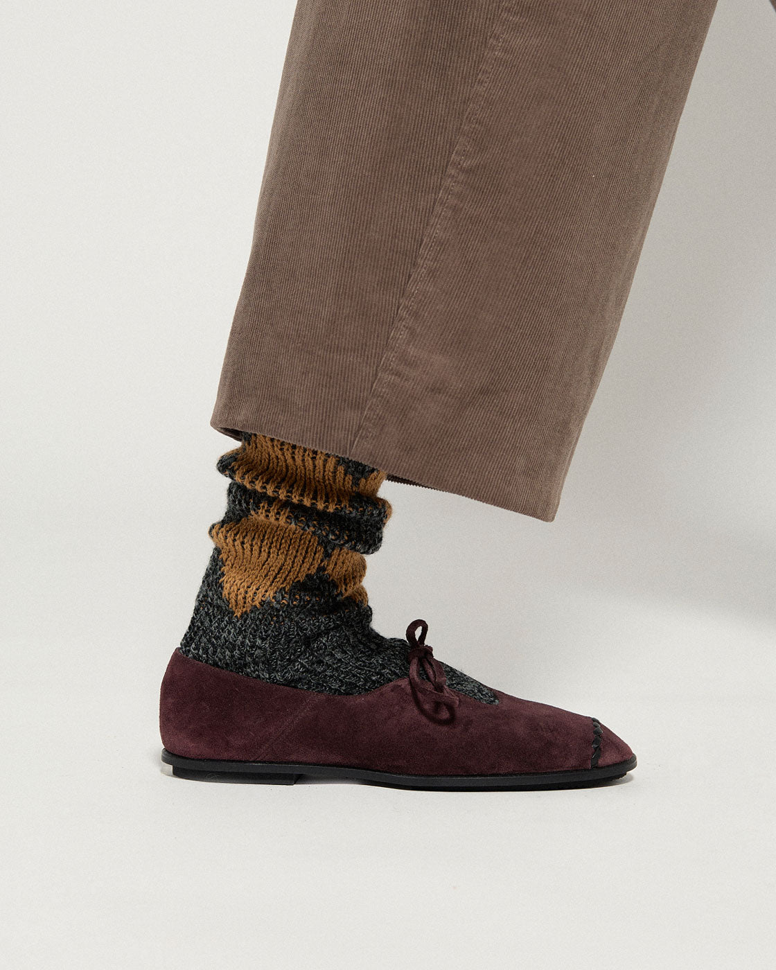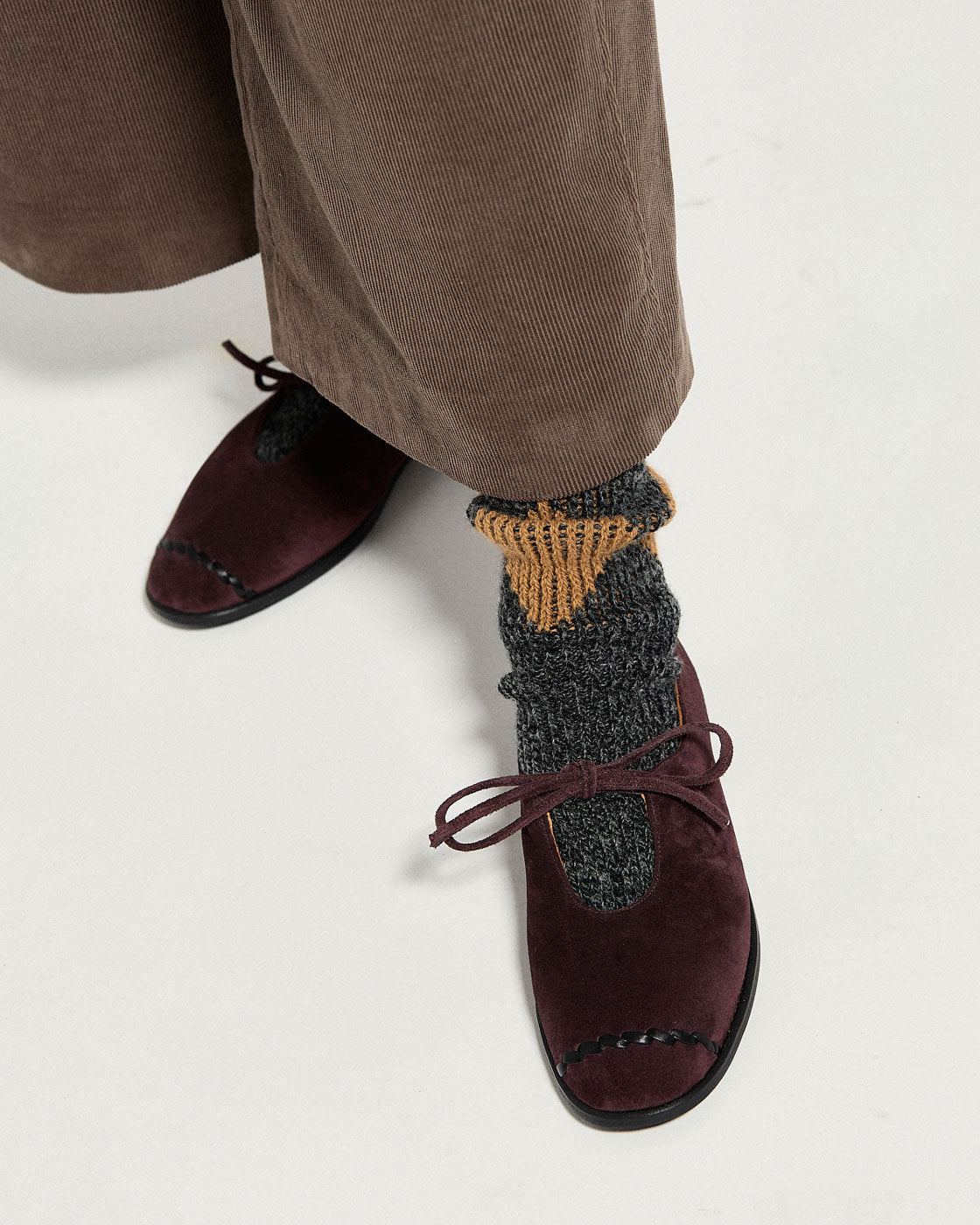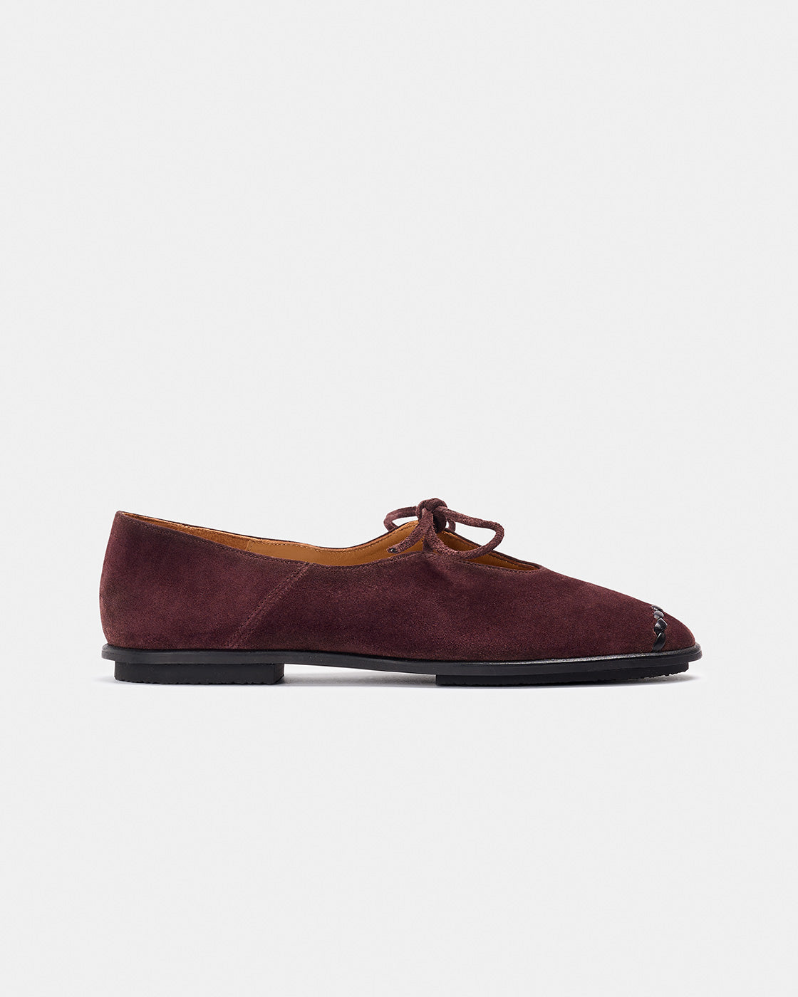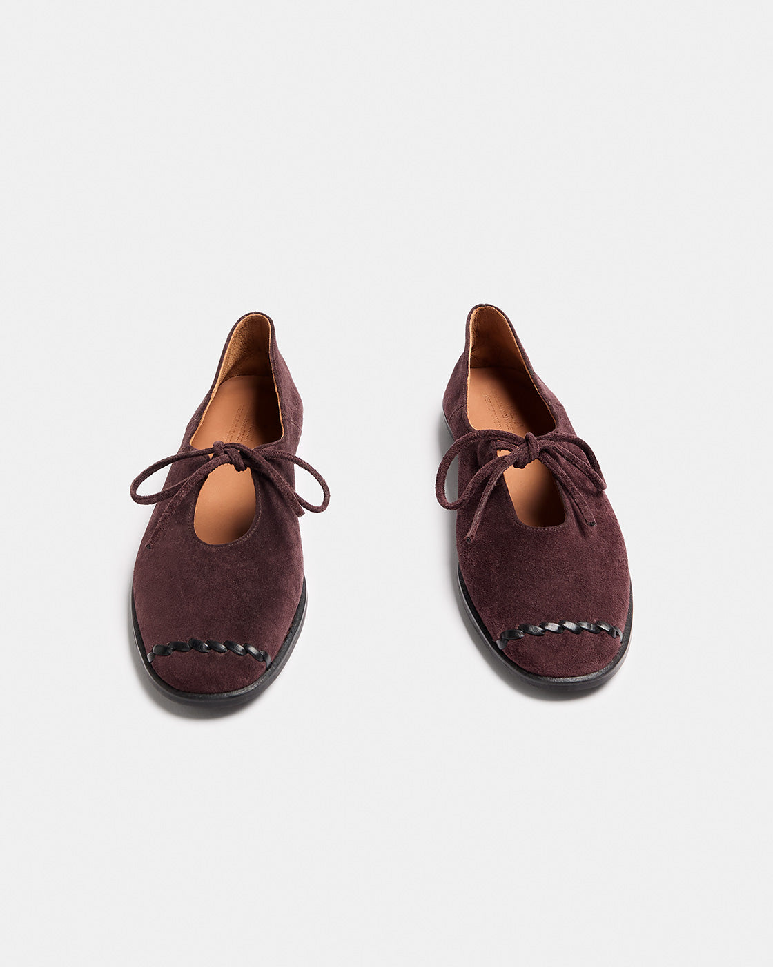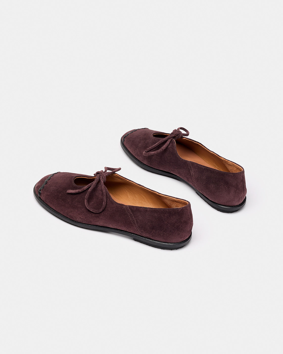 LAVINIA is a ballerina shoe with a braided leather toe. The upper is suede leather with a braided goatskin detail. It fastens with a leather lace. The lining and insole are made of natural cowhide. The sole is a split tread of virgin rubber, with a leatherlite heel and midsole. The round toe and heel are 1 cm high. Made in Spain.