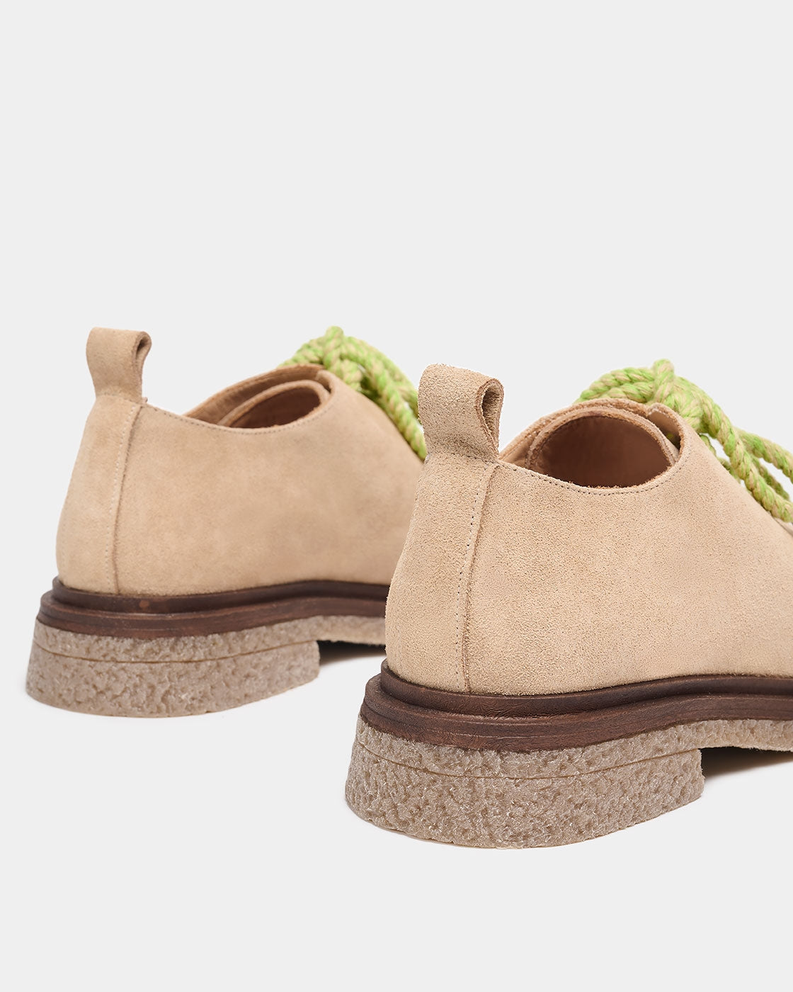 FAGUS is an Oxford style shoe ideal for everyday wear. The upper is waterproof split suede. Cotton laces in a contrasting color. Cowhide leather lining. Removable foam insole. Rounded toe and two-toned non-slip crepe rubber sole; Its height is 3cm for enhanced back comfort.