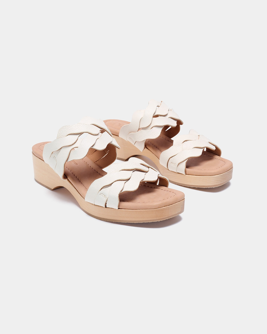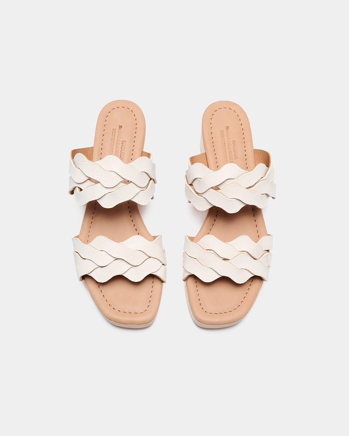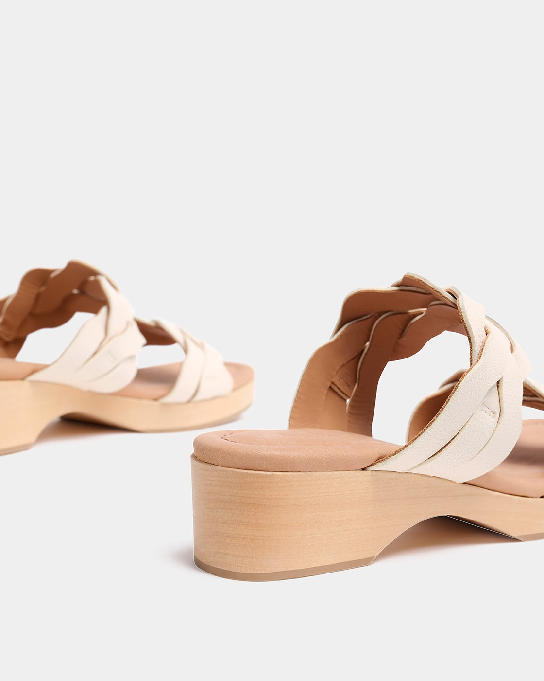 Heiwa is a mule sandal with two uppers made of interwoven scalloped straps. Sheepskin leather upper and natural cowhide leather lining. The insole is cushioned with foam and lined with leather for better breathability. Clog-style sole of solid linden wood and non-slip rubber outsole. The heel height is 2 cm, measured at the center of heel not at the back. Wide heel for improved comfort.