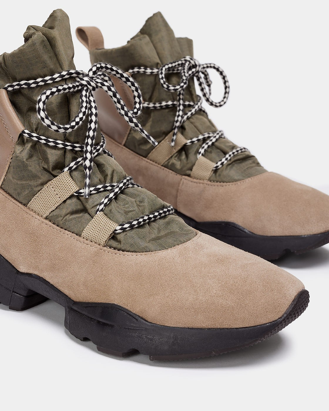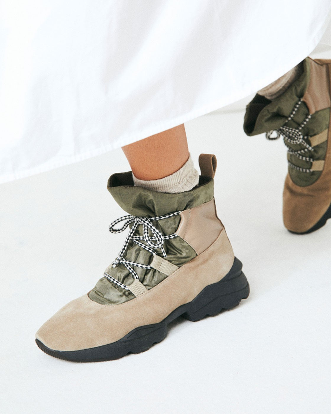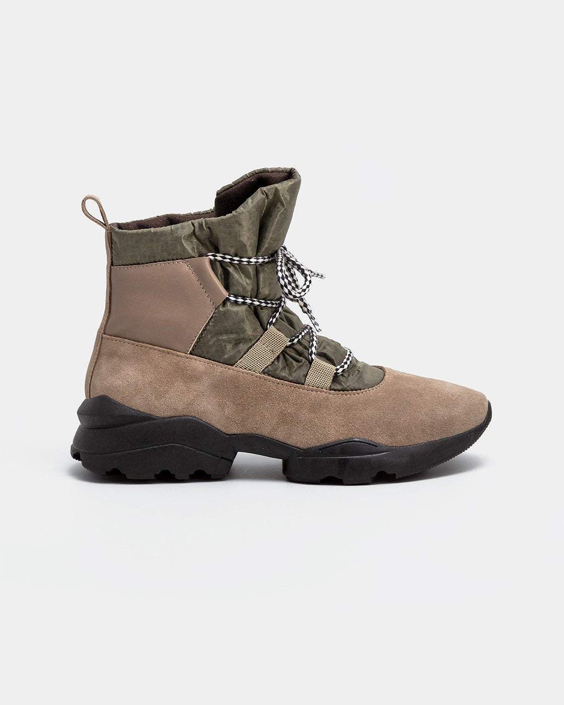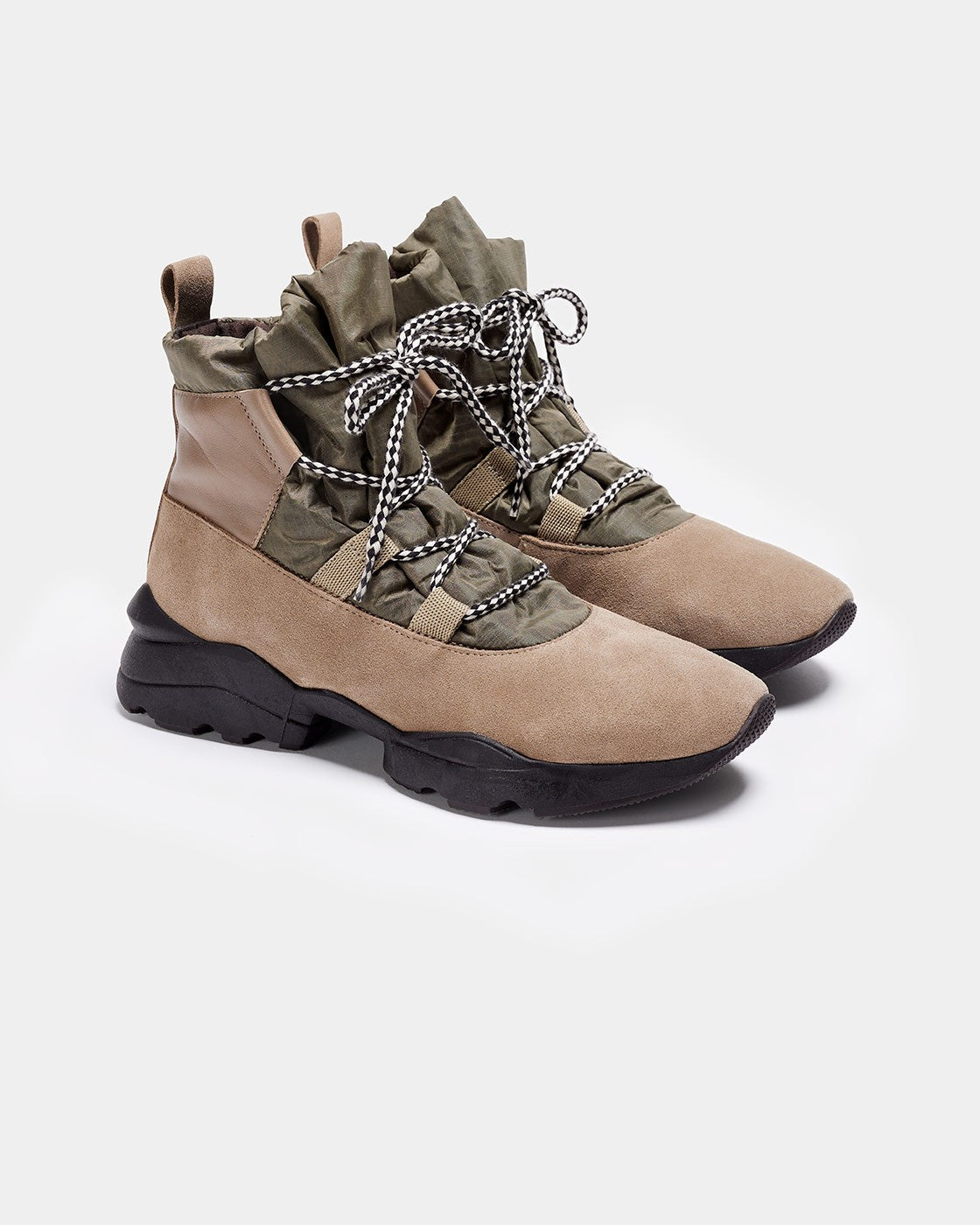 ARIETIS is a sporty ankle boot. Uppers made of water-resistant recycled polyester, cowhide leather and waterproof-treated split suede. The shaft opens in a bag effect, perfect for all foot types. Matching laces in the same color. Thick TR rubber sole. Fabric lining. Sole height of 4 cm for enhanced back comfort.