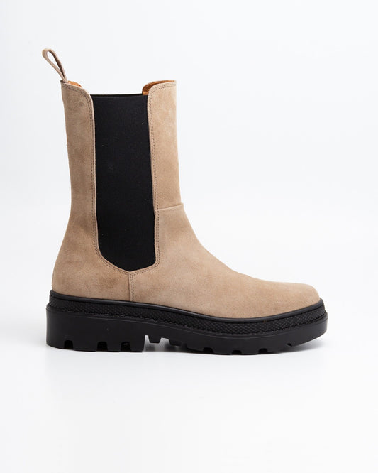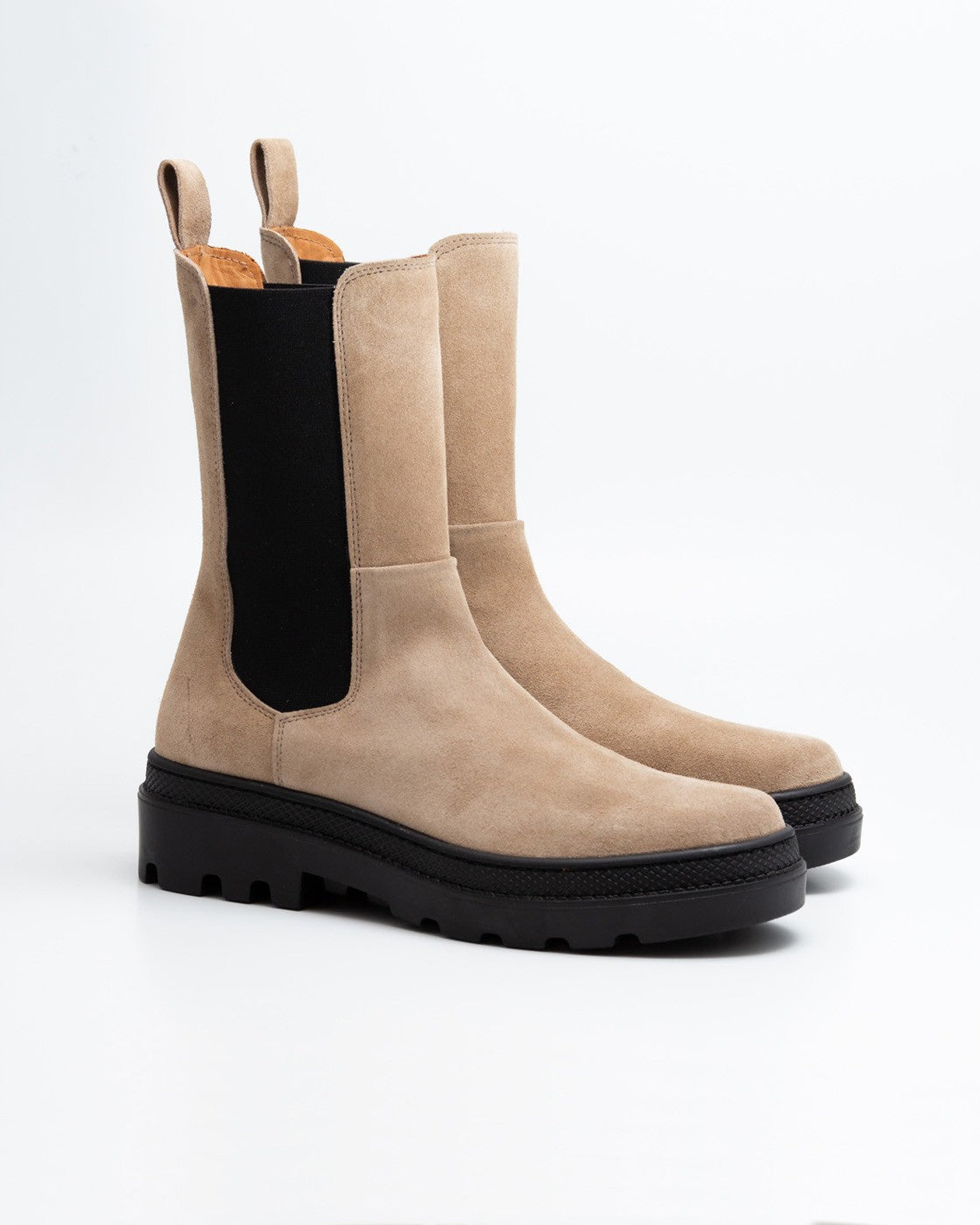 Baria is a high Chelsea boot with a trekking sole. Upper made of oiled split suede with elastic on the sides. Natural cow leather lining. Removable foam insole. The total height is 3.5 cm for greater back comfort.