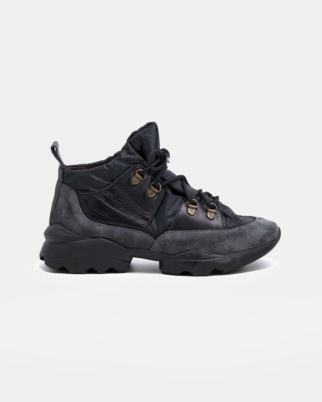 ERSA is a sporty ankle boot. Uppers made of water-resistant recycled polyester, cowhide leather and waterproof-treated split suede. The shaft opens in a bag effect, perfect for all foot types. Matching laces in the same color. Thick TR rubber sole. Fabric lining. Sole height of 4 cm for enhanced back comfort.
