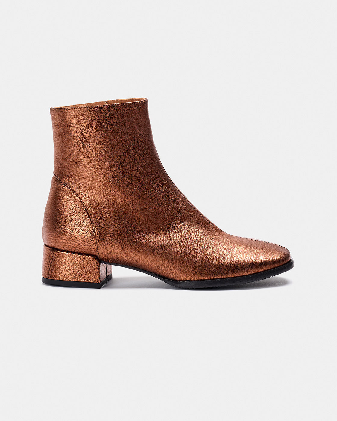 BIELDO is a heeled ankle boot with an interior zipper, perfect for every day. The upper is made of metallic sheepskin. The lining is cowhide. The heel height is 3 cm, measured at the center of the heel and not at the back. The heel is wide for greater comfort.