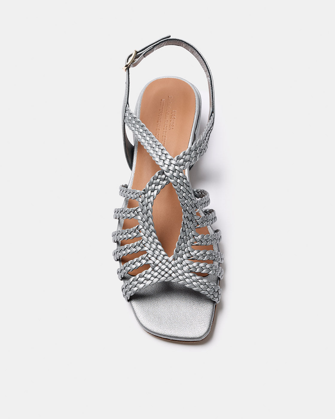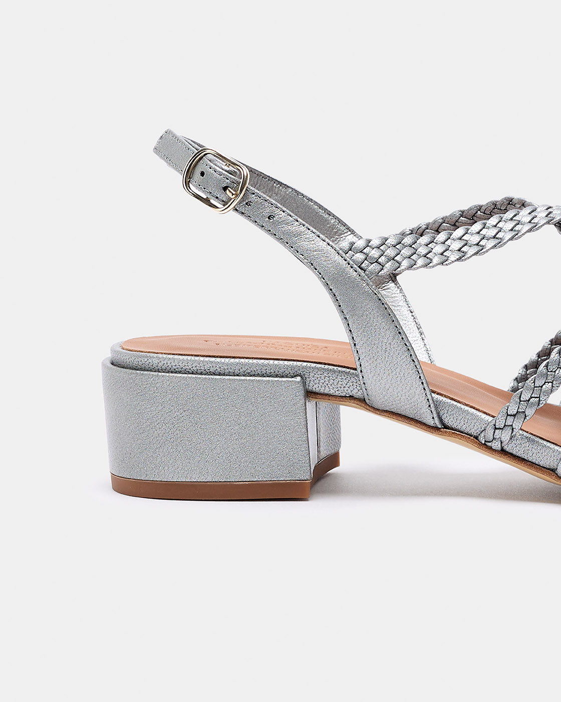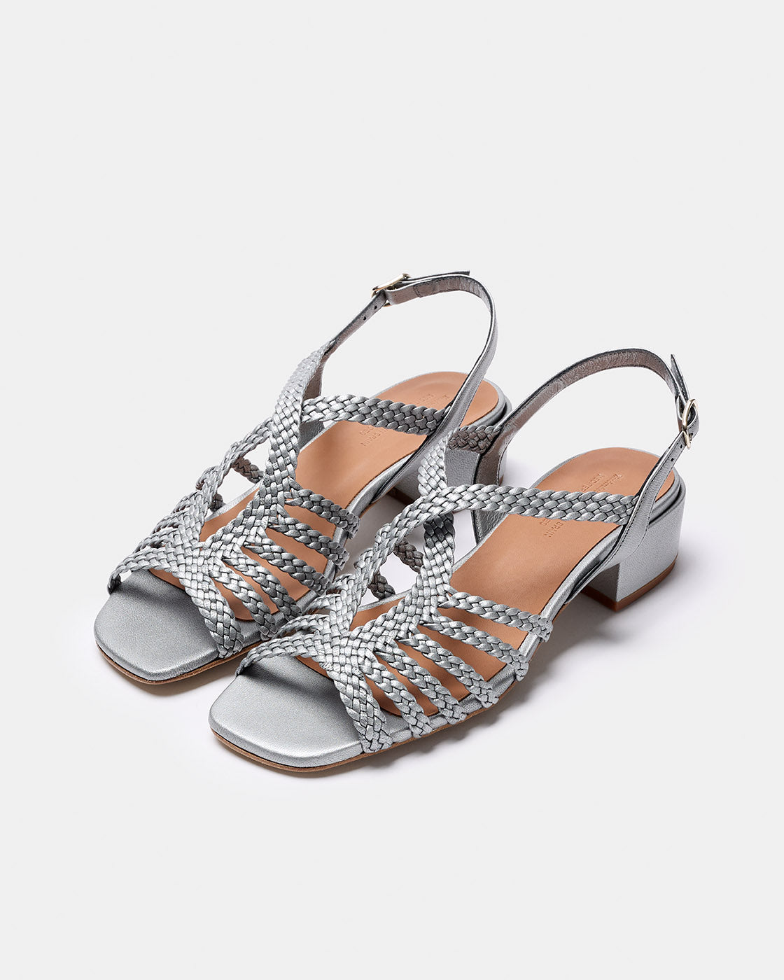 Racó is a Naguisa classic, a sandal with a square toe and hand-braided pearlescent goat leather straps crafted by artisans. The crisscross straps on the instep provide foot support and comfort. It fastens at the heel with a buckle. Goat leather lining and natural cowhide insole for better foot breathability. Leather sole. The heel height is 3 cm. The heel is wide for greater comfort. Made in Spain.