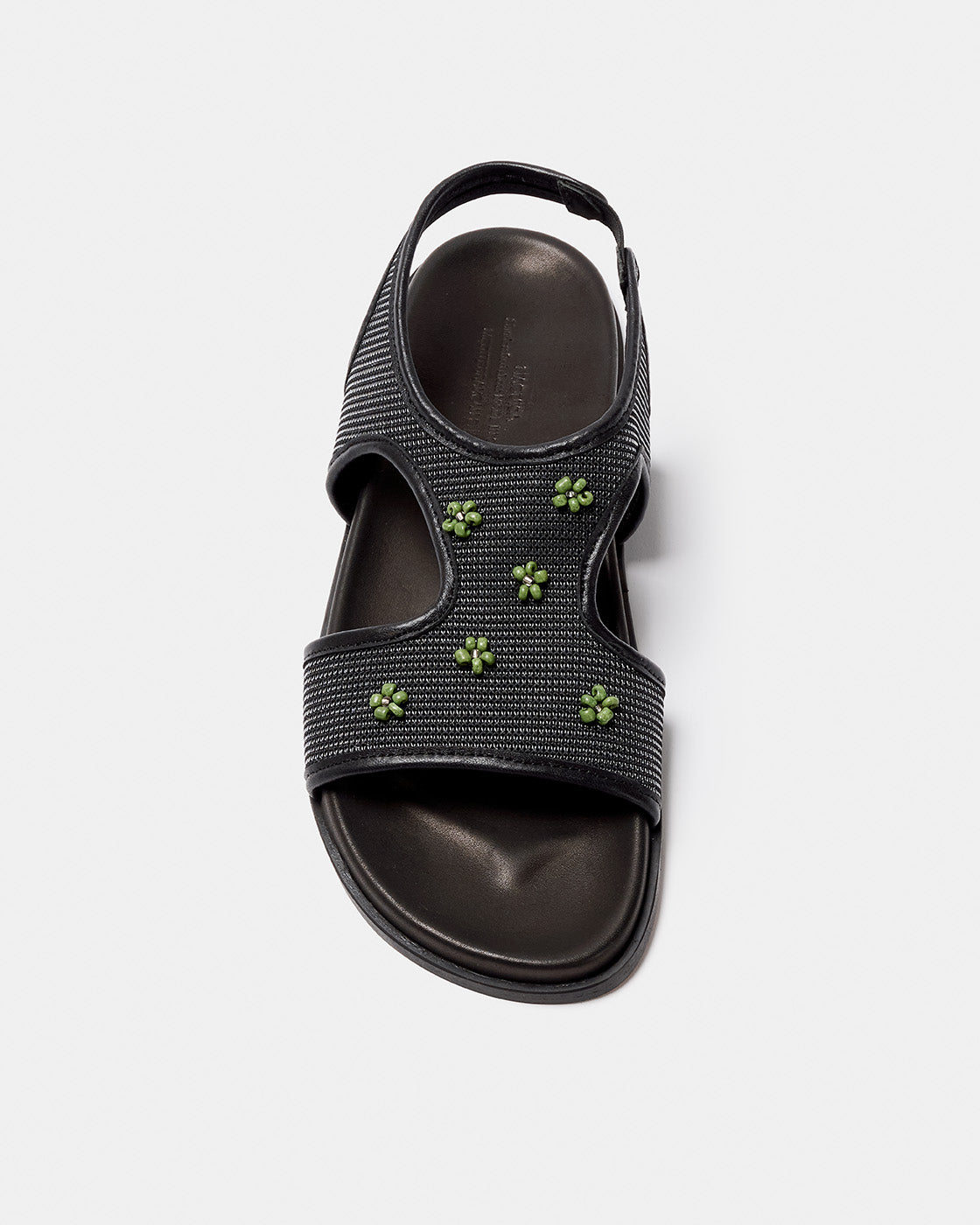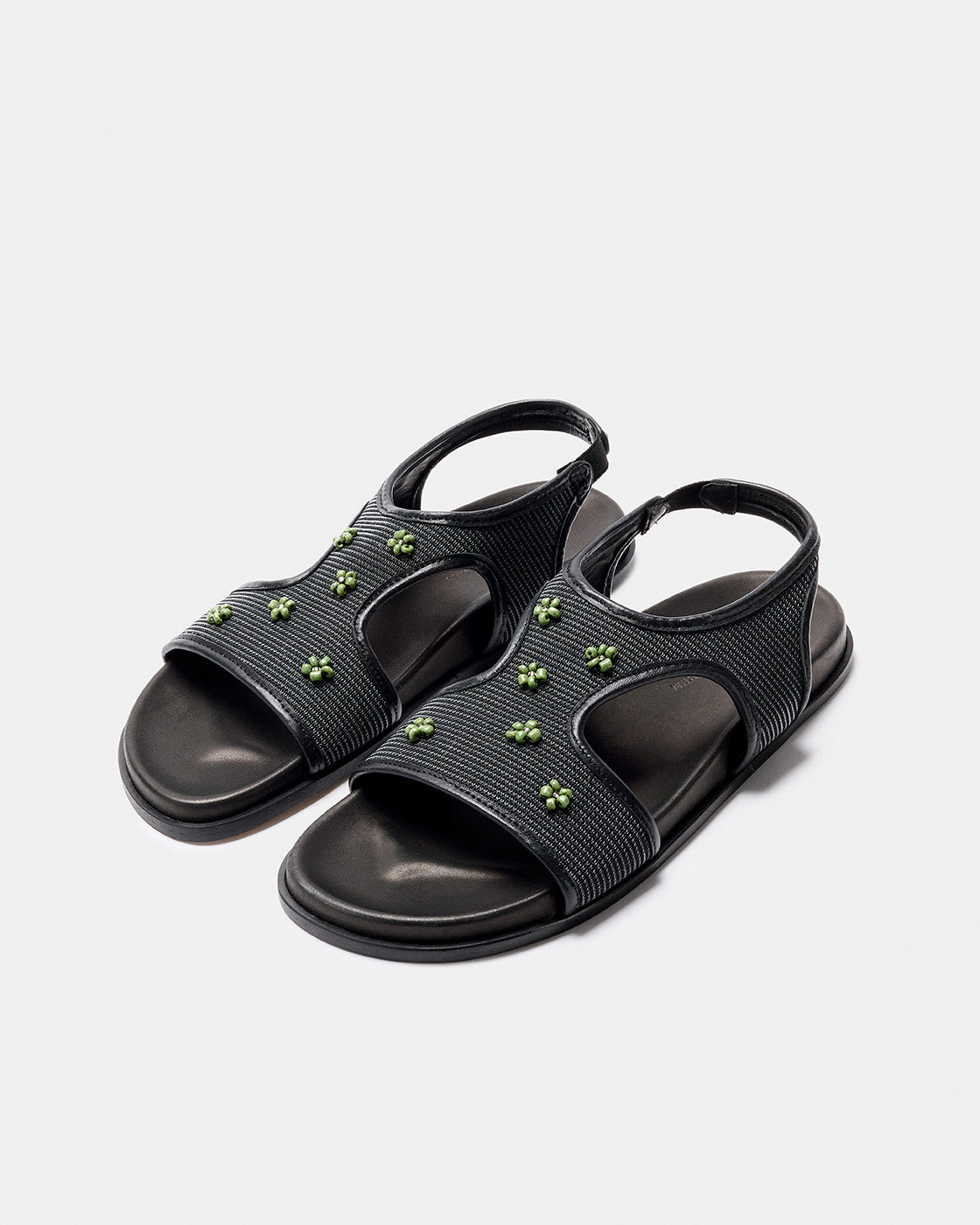 아다이아(Addaia)는 갑피를 따라 수작업으로 꿰맨 화려한 비즈로 꽃무늬 디테일을 더한 샌들입니다. 뒤꿈치 안쪽에 신축성 있는 밴드가 있어 고정할 수 있습니다. 갑피는 염소 가죽으로 마감된 메시 소재로 제작되었습니다. 안창은 해부학적 형태로 제작되었으며 통기성을 위해 소가죽 안감을 사용했습니다. 밑창은 줄무늬 패턴의 가죽으로 제작되었습니다. 스페인에서 제작되었습니다.