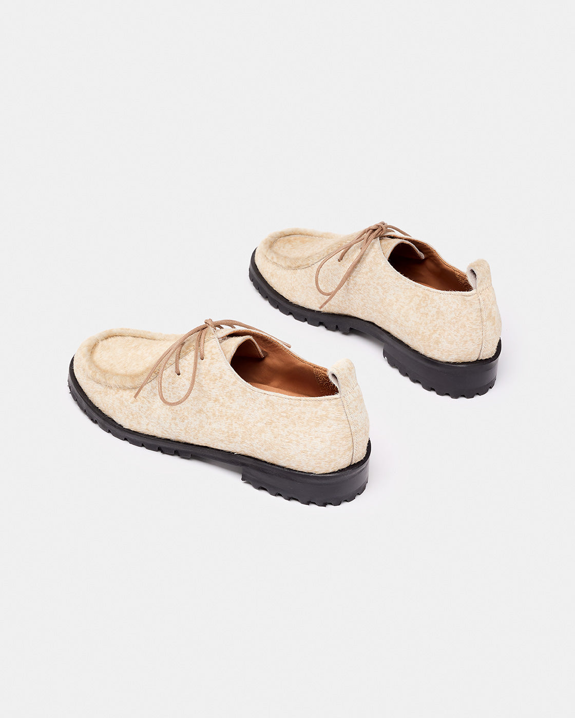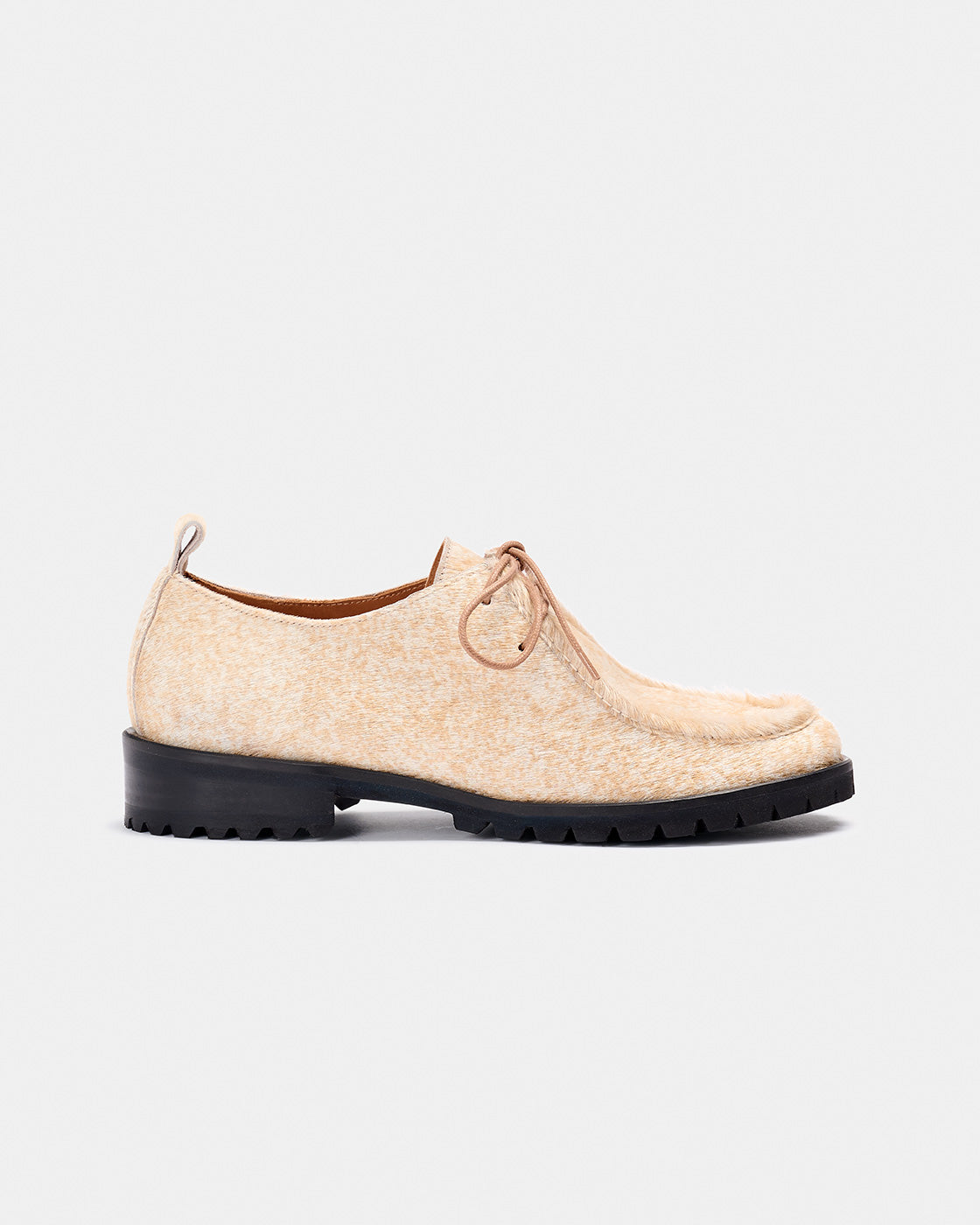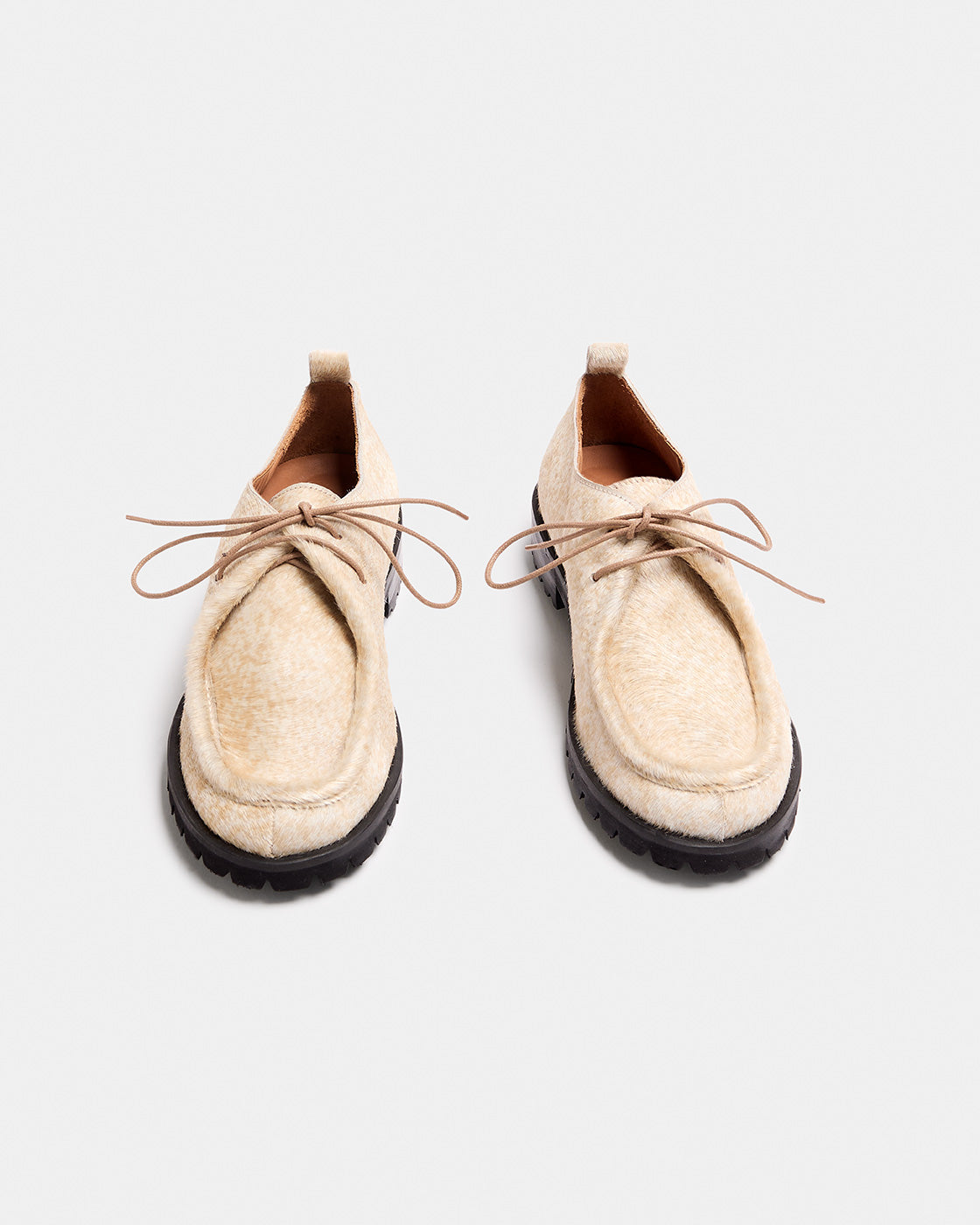 KHOV는 왈라비 스타일의 신발입니다. 갑피는 메탈릭 양가죽으로 제작되었으며, 갑피와 동일한 색상의 끈으로 고정됩니다. 소가죽 안감, 탈착식 폼 깔창, 둥근 앞코, 줄무늬 고무 및 가죽 밑창, 동일한 색상의 이중 스티치 웰트가 특징입니다. 허리를 더욱 편안하게 해주기 위해 바닥 높이를 2.5cm로 맞췄습니다.