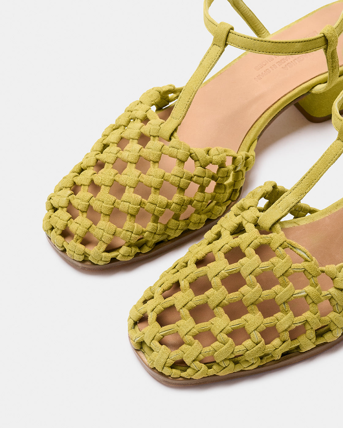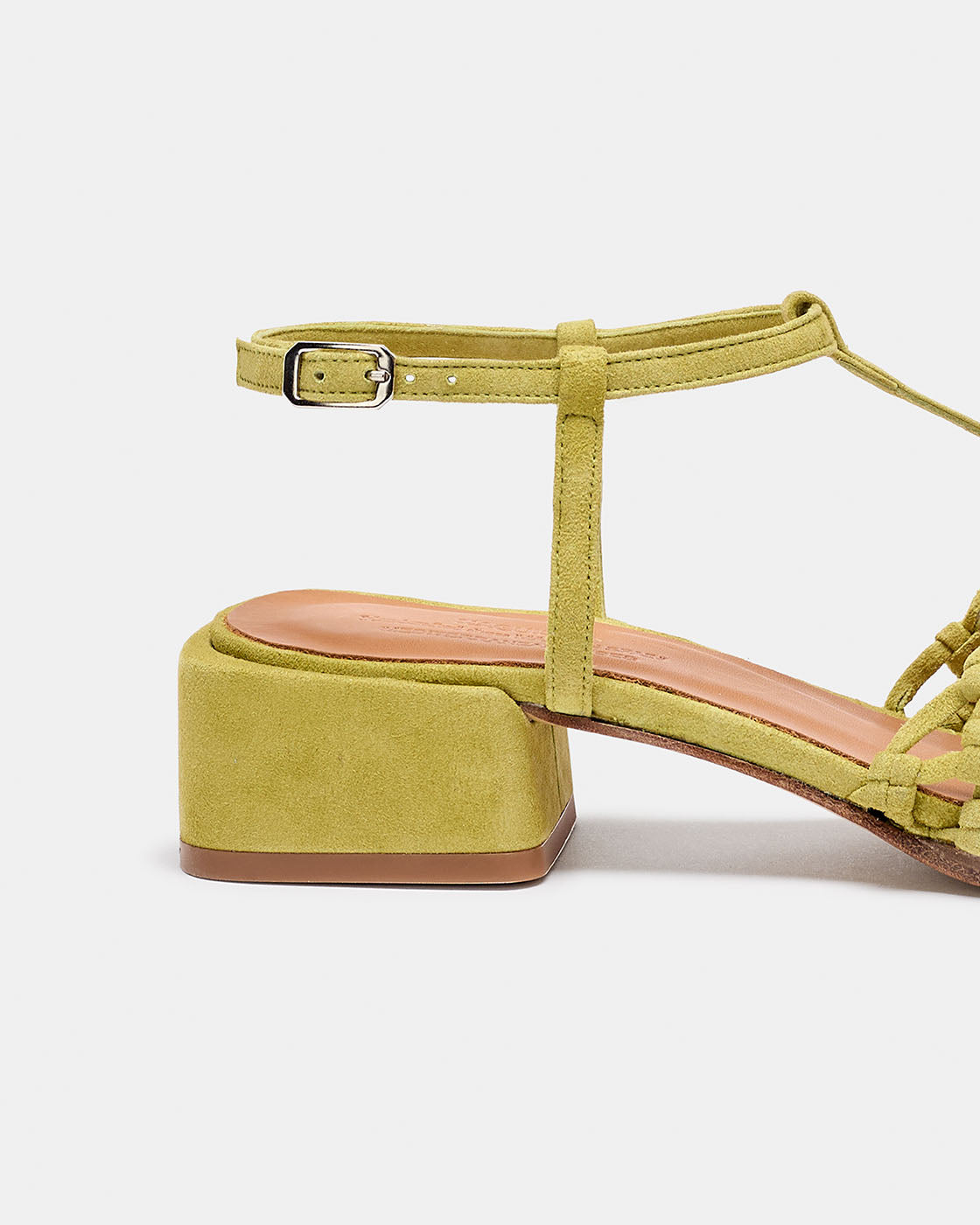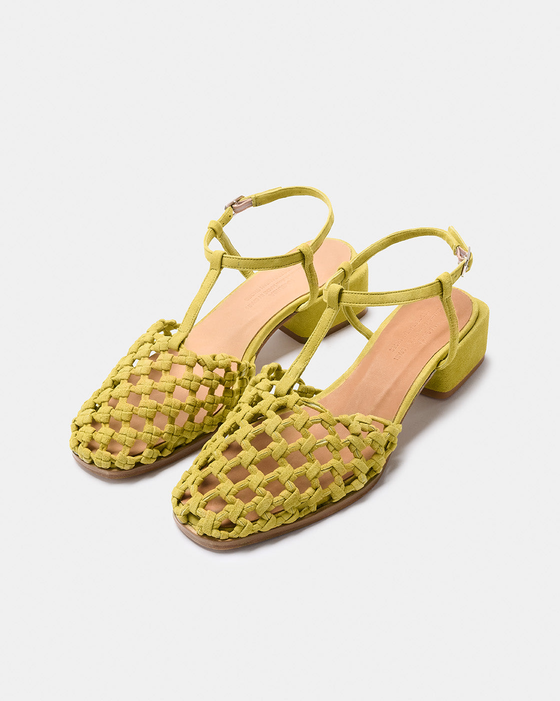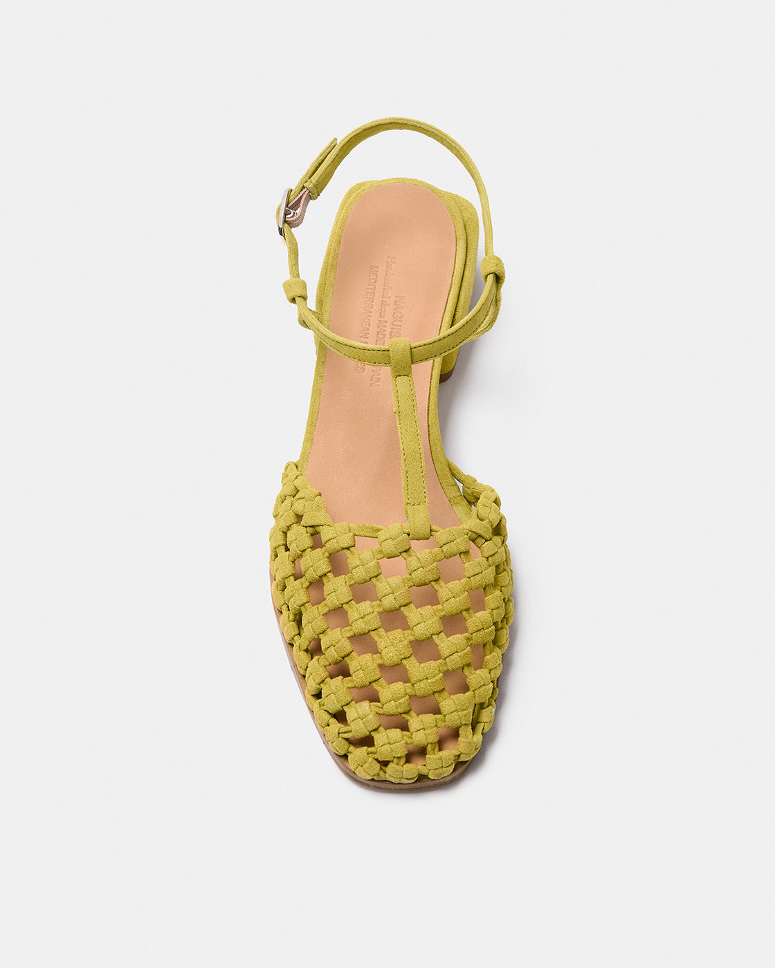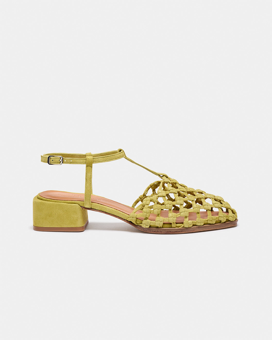 Adra es una sandalia de punta cerrada y trenzado de nudos hechos a mano y continua en tira T. Se ajusta mediante hebilla en el talón. Cortes de piel de cabra. Forro de piel de cabra. La planta en piel vacuna para dejar transpirar mejor tu pie. Suela de cuero. La altura de tacón es de 3,5 cm. El tacón es ancho para mayor comodidad. Fabricado en España.