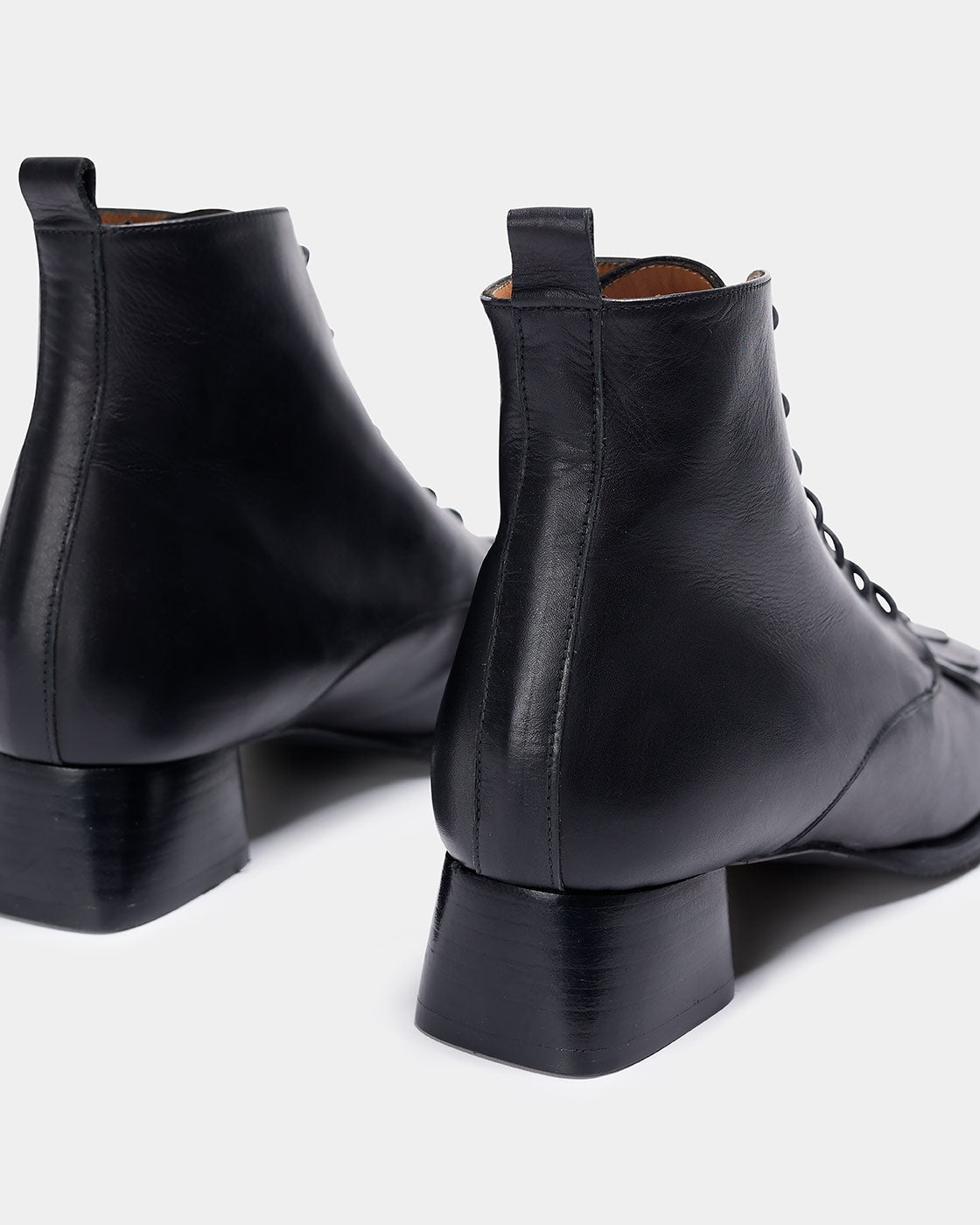 CAELUM es un botin tipo blucher con caña baja. Detalle de flecos en la puntera. Los cortes son en piel vacuna y cierre mediante cordones de algodón encerados. El forro y la planta son de piel vacuno para dejar transpirar mejor tu pie. La altura del tacón es de 3 cm, medido en la parte central del mismo y no atrás. El tacón es ancho para mayor comodidad de tu espalda.