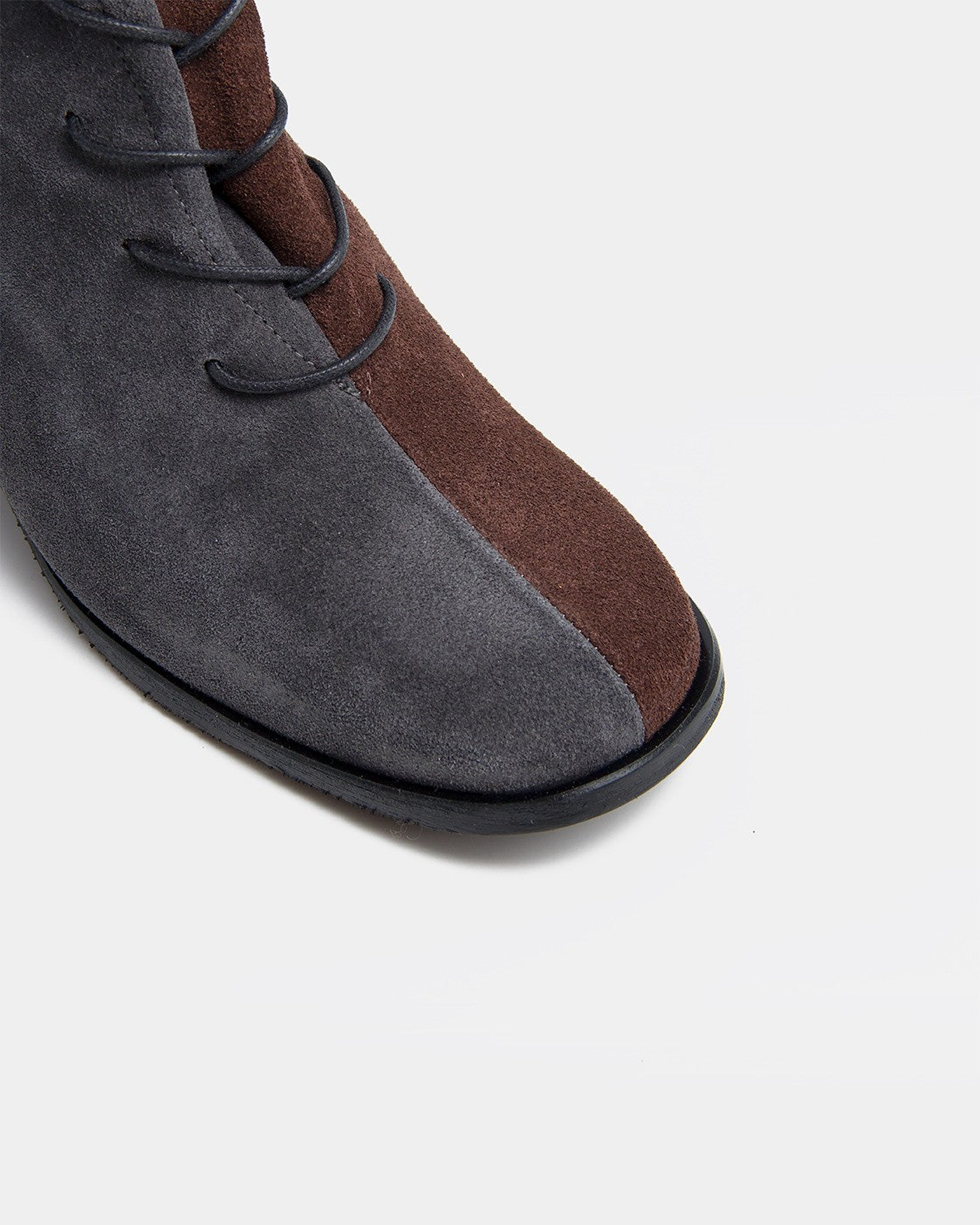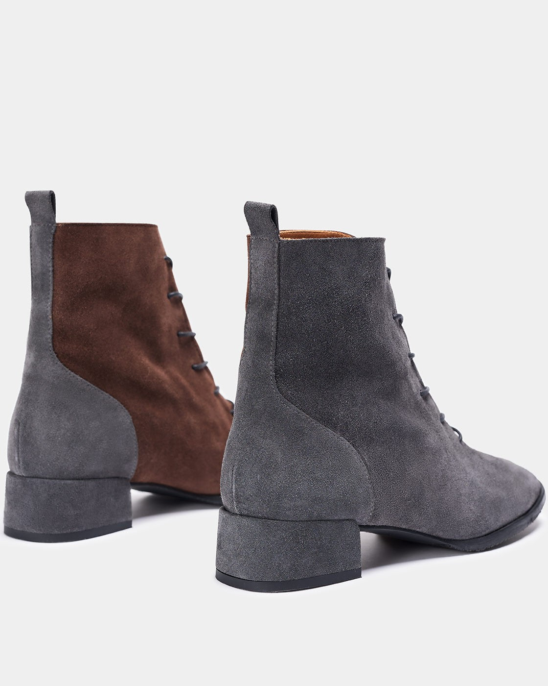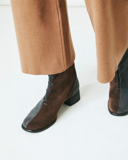 INDUS es un botin bicolor de caña baja. Los cortes son de piel serraje engrasado con tratamiento hidrofugante. La lengueta y el corte van unidos y el cierre es mediante cordones haciendo un efecto de bolsa. El forro y la planta son de piel vacuno para dejar transpirar mejor tu pie. La altura del tacón es de 3 cm para mayor comodidad de tu espalda.