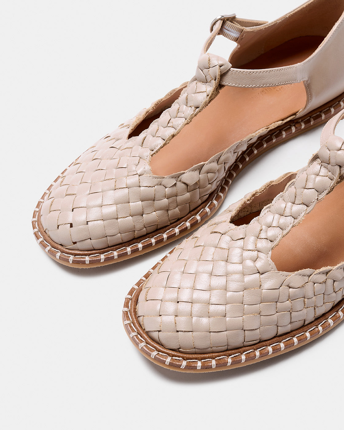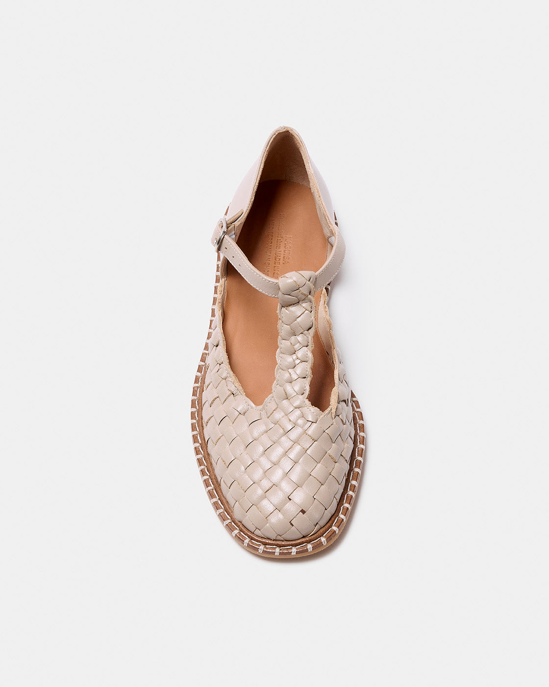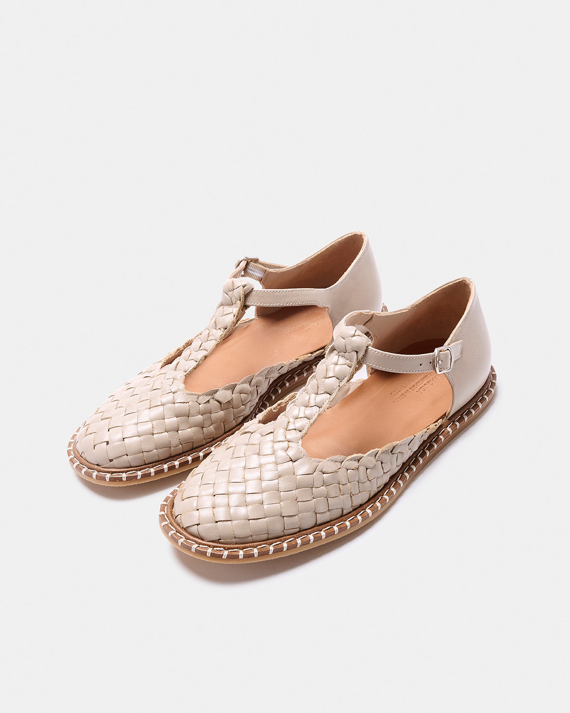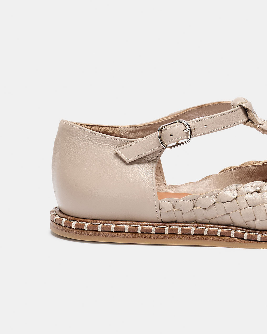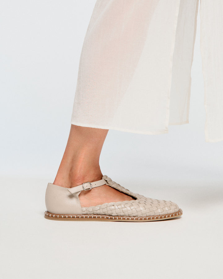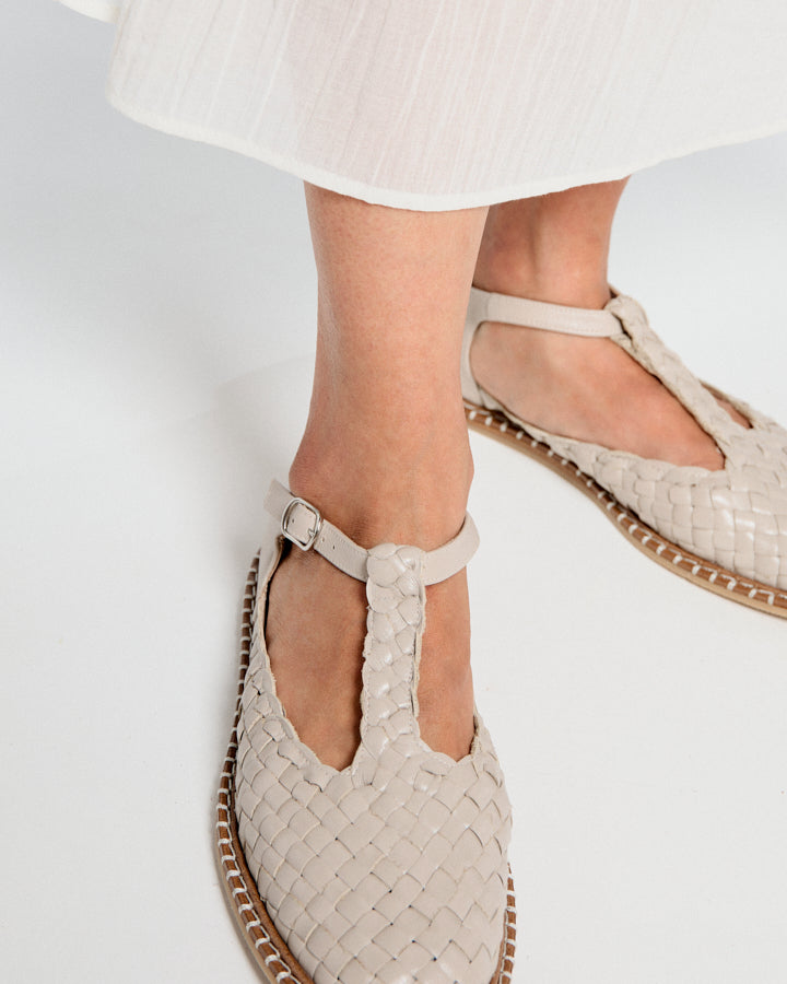 Fragaria es un bailarina con cierre de hebilla tipo T. El corte es piel vacuno trenzado a mano por artesanos. Forro de piel de cabra. Piso de cuero con cerco e hilo decorativo, altura de 0,5 cm, suela rayada y tapa de goma inyectada. Fabricado en España