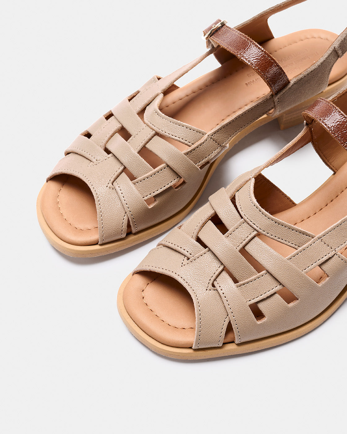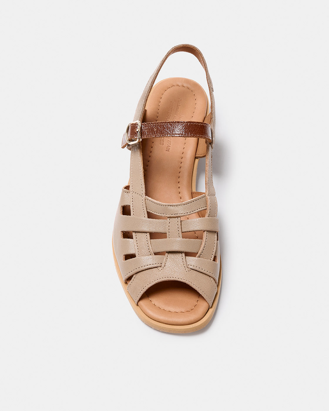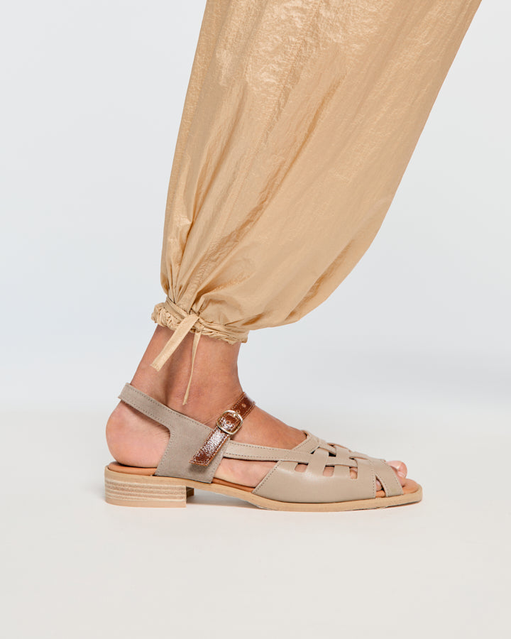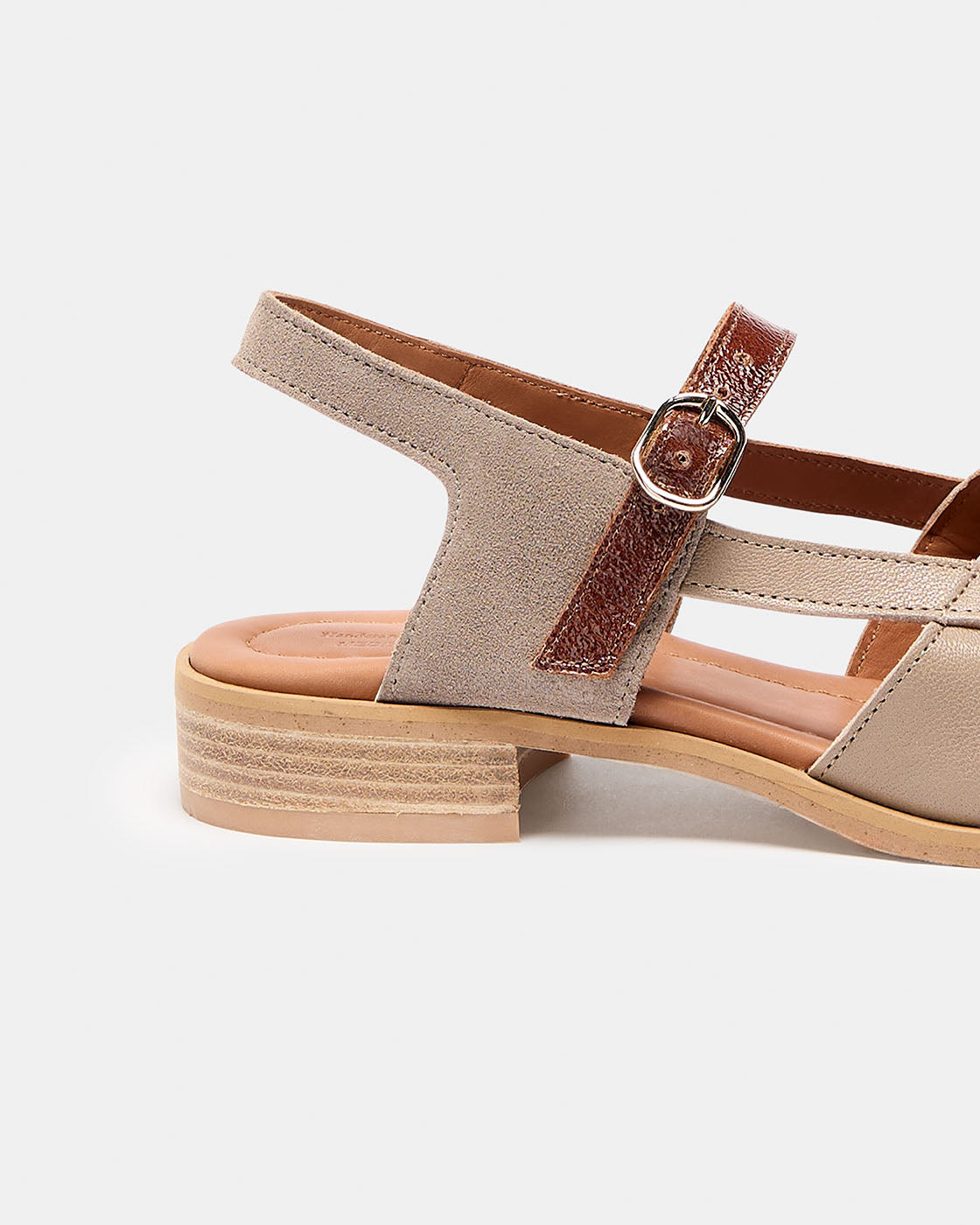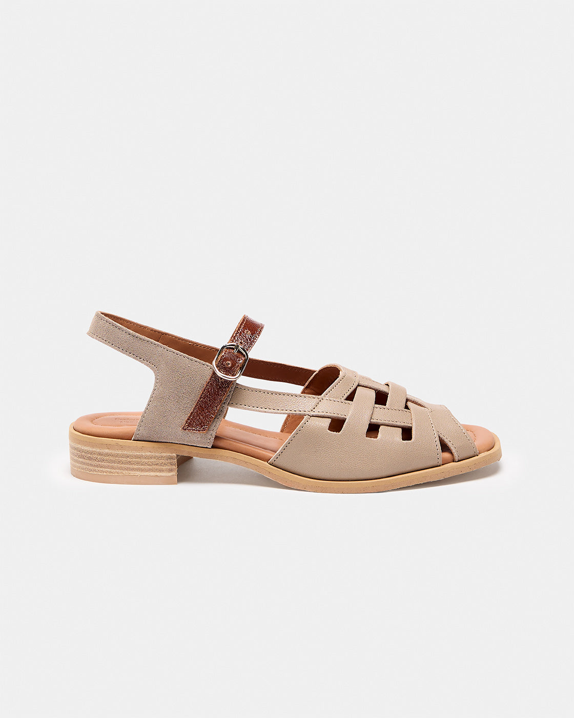 Manto es una sandalia estilo cangrejera, destalonada y con cierre de hebilla lateral. Los cortes son de piel de cabra con acabado metalizado y el forro de piel vacuna. La planta es acolchada con foam y forrada de piel para dejar transpirar mejor tu pie. Piso corrido de cuero y patín de goma antideslizante. La altura de tacón es de 2 cm, medido en la parte central del mismo y no atrás. El tacón es ancho para mayor comodidad.