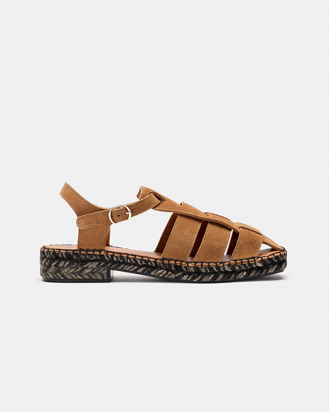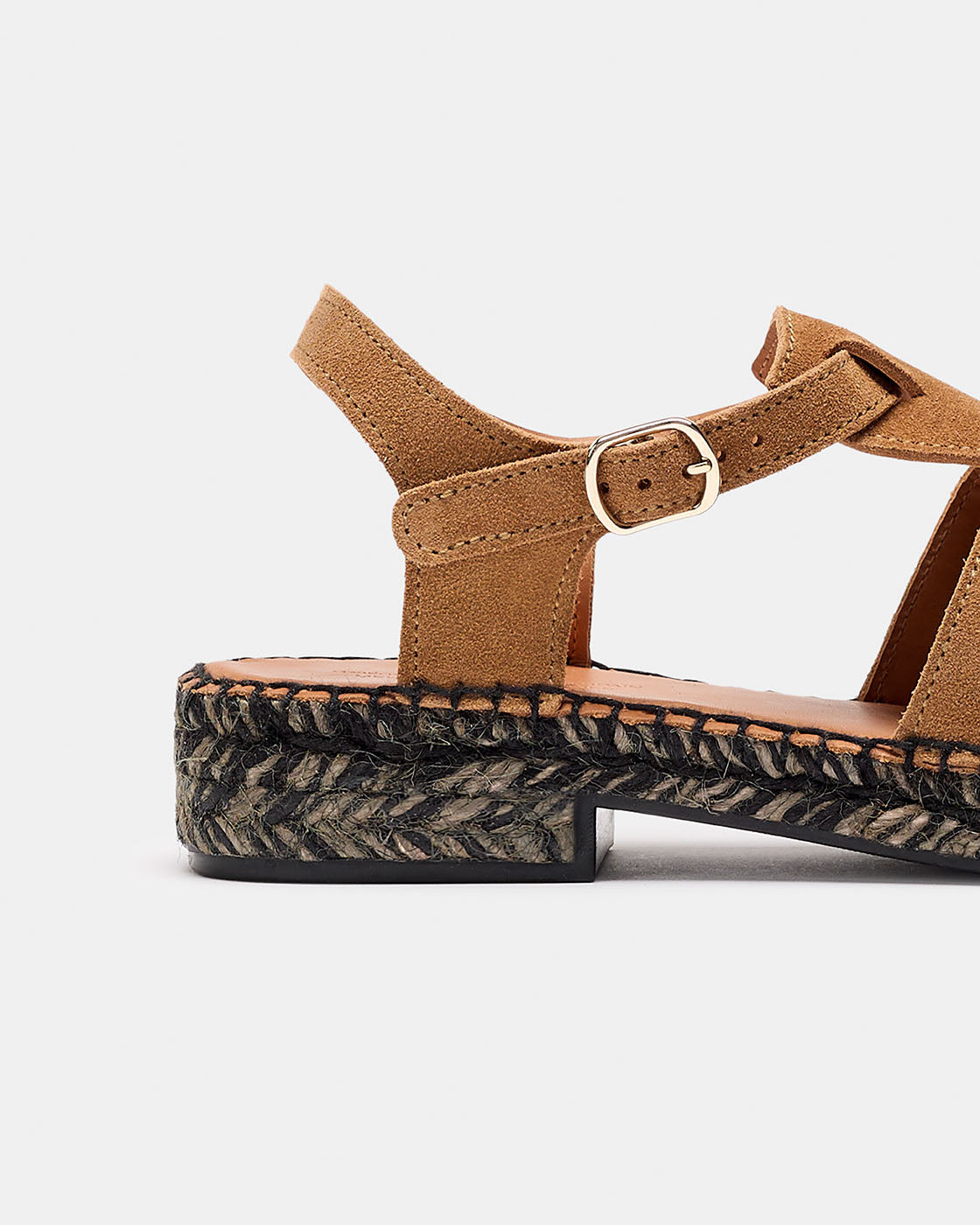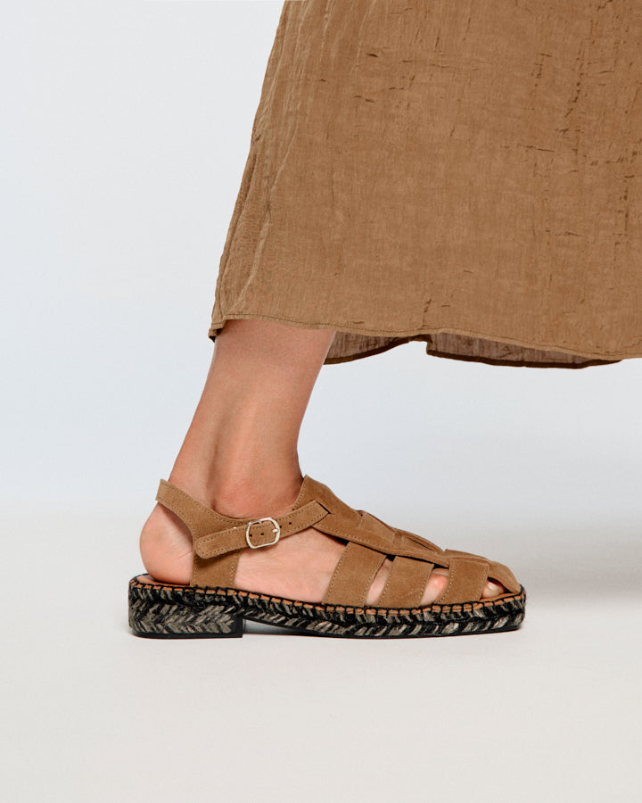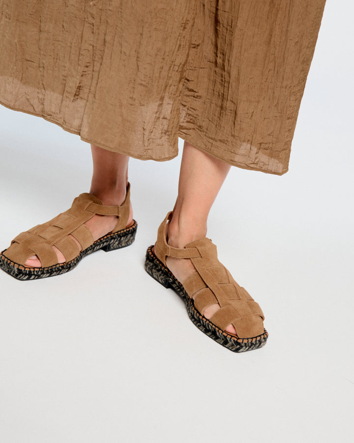 Sativa es una alpargata tipo cangrejera con puntera cerrada. Los cortes son en piel serraje. Cierre con hebilla lateral. Forro de piel. La planta es acolchada con foam y forrada de piel vacuna natural para dejar transpirar mejor tu pie. La suela, de puntera cuadrada, está hecha con una trenza sencilla de yute bicolor. Con un pequeño tacón y suela de goma antideslizante. La altura total es de 3,5 cm. Fabricado en España.