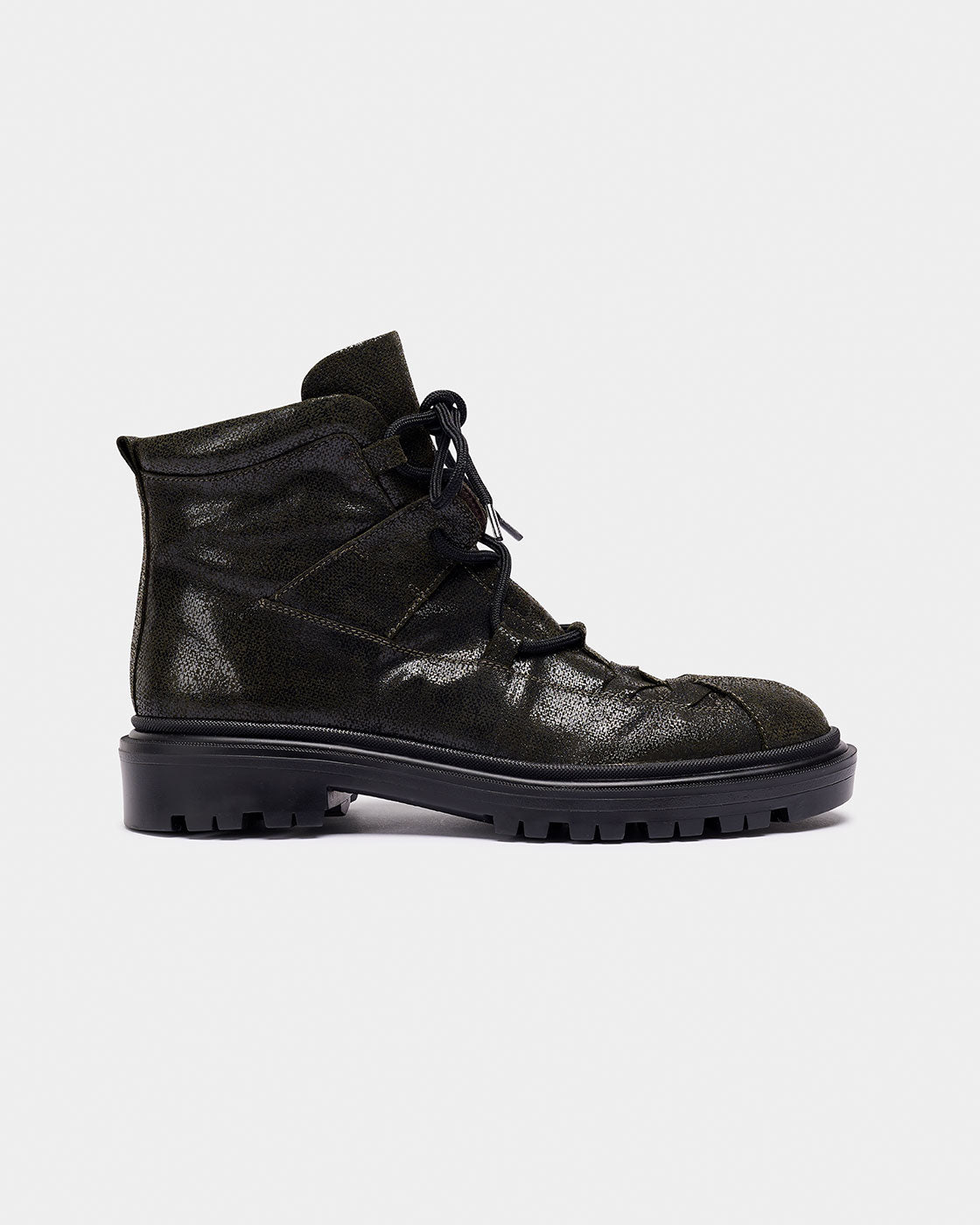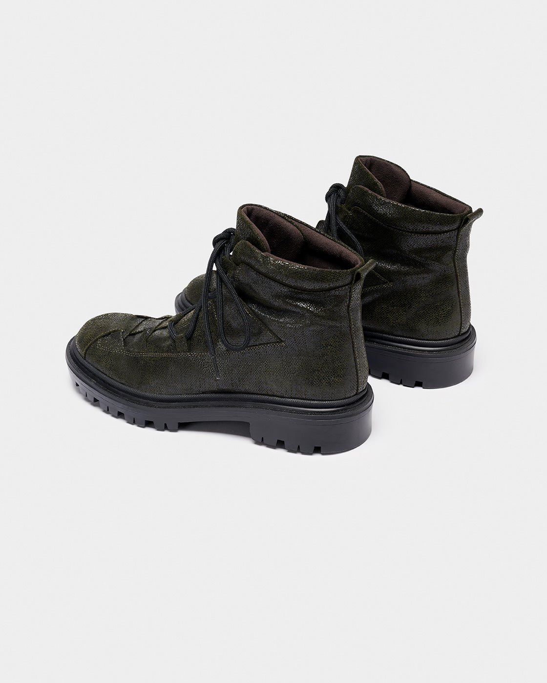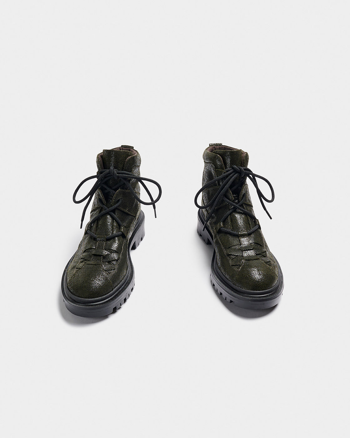 ZEA es una bota con detalle de piel pasada en la punta. El corte es de piel vacuno con efecto brillo. Cierre mediante cordones a tono. Forro de tejido. Puntera redonda. Suela gruesa tipo track. La altura del piso es de 3 cm para mayor comodidad de tu espalda.
